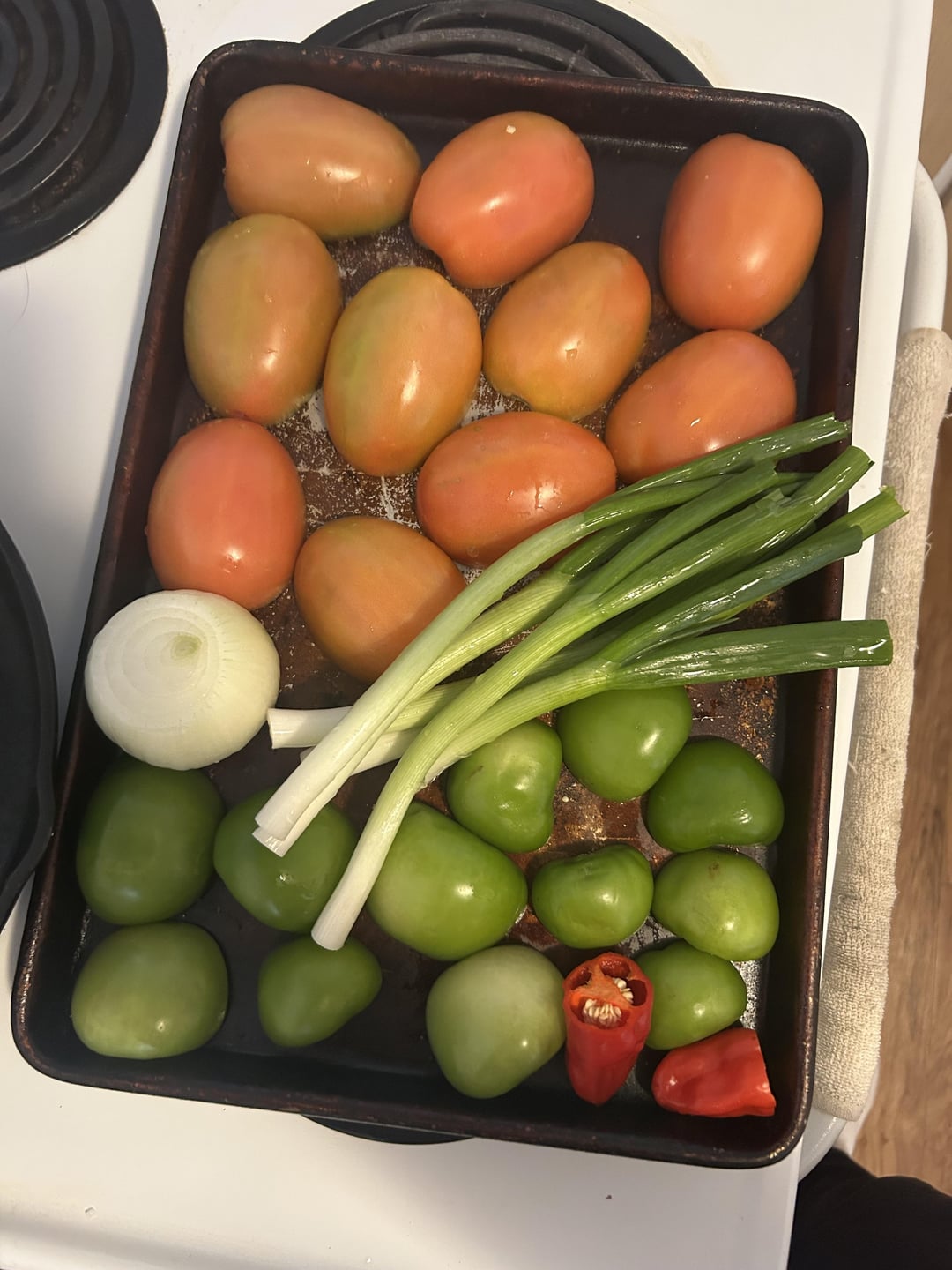 I put tomatoes, tomatillos, habanero, onion, and one of green onions under the broiler until charred. (Forgot to take picture of that)