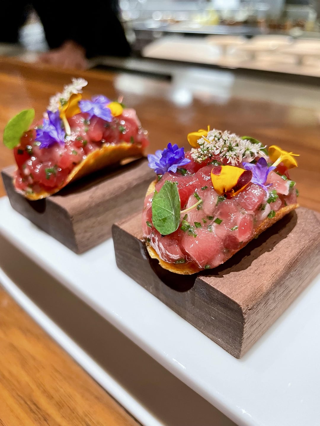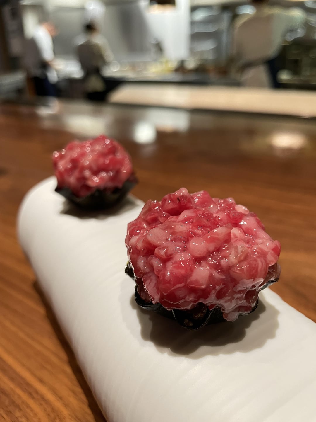 After the first three small bites (Tuna, Foie Gras, A5 Tartare), it was clear that we were in for a great night. Not only were the flavors incredible and bright, but the precision in the kitchen was unmatched (we sat at the counter in both restaurants, and this is where one major difference came into play). Being able to observe the ease in execution and the seamless communication of the kitchen was its own treat and added to our overall enjoyment.