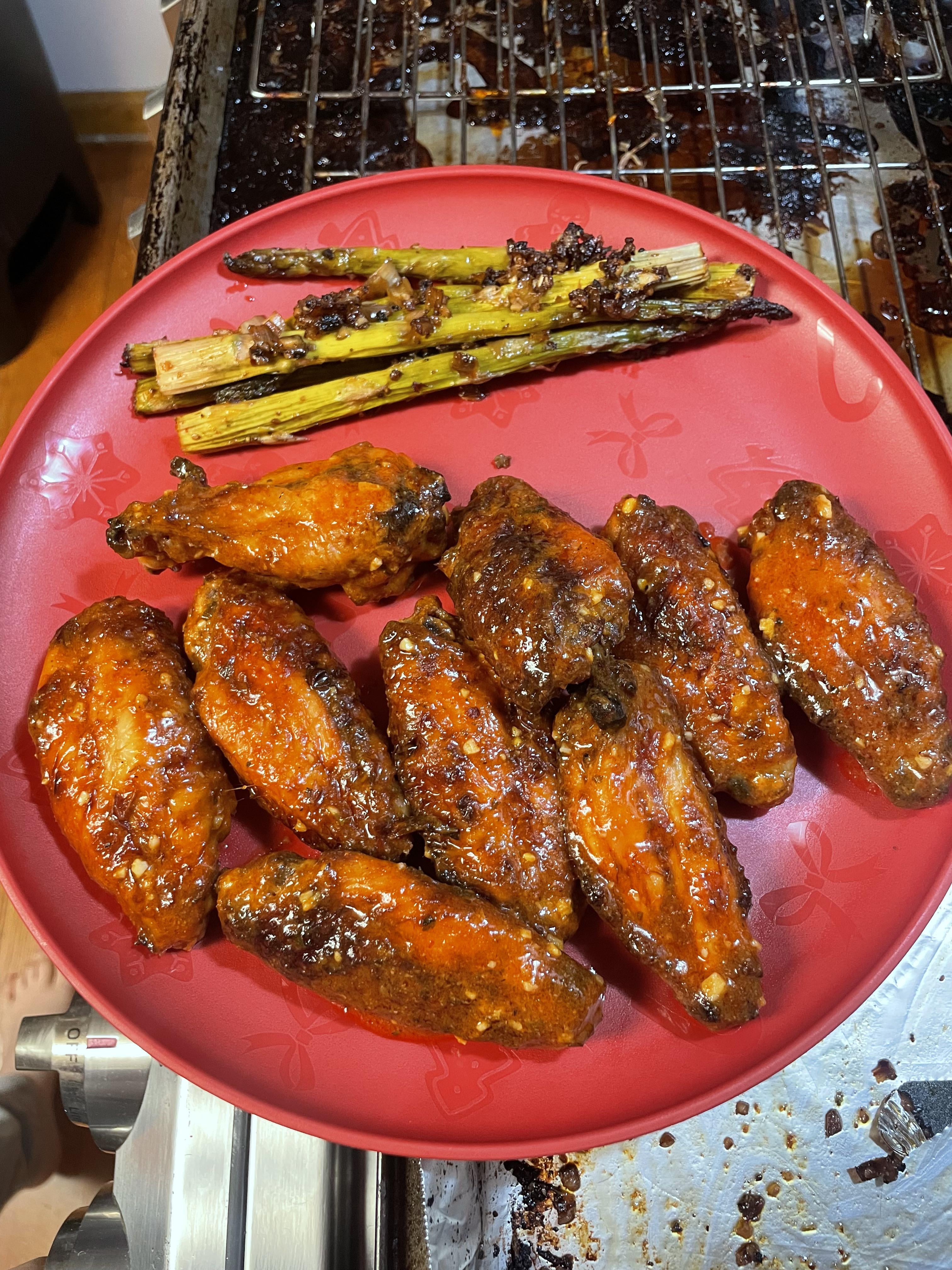 1. Ok, I’m not the only person who eats asparagus with wings 🥹. And those wings look delicious 😋- recipe?