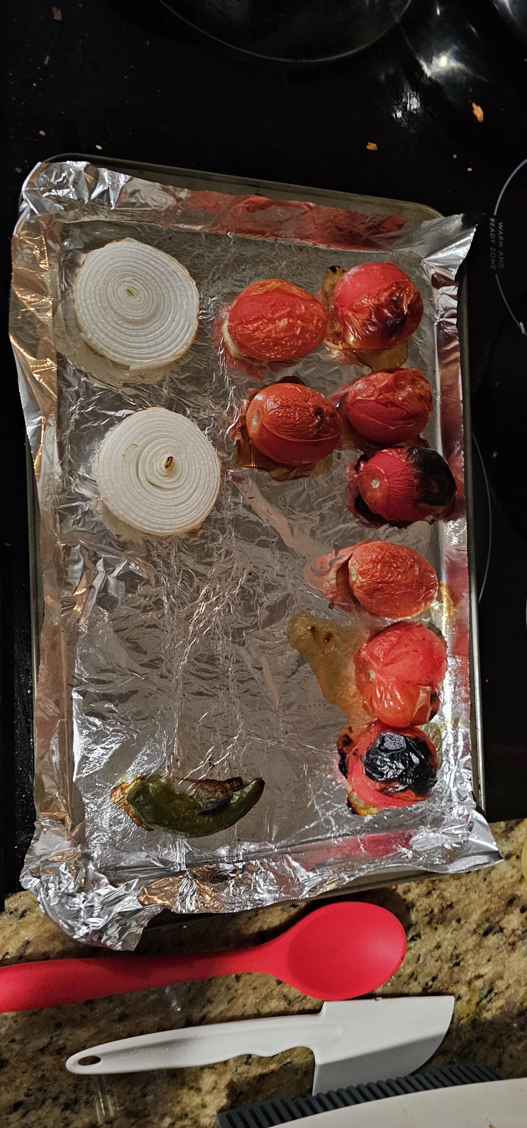 Roasted 20 minutes, broiler 5 minutes (except garlic, kept raw) then added remaining ingredients and blended in food processor. Boullion made a noticable difference.