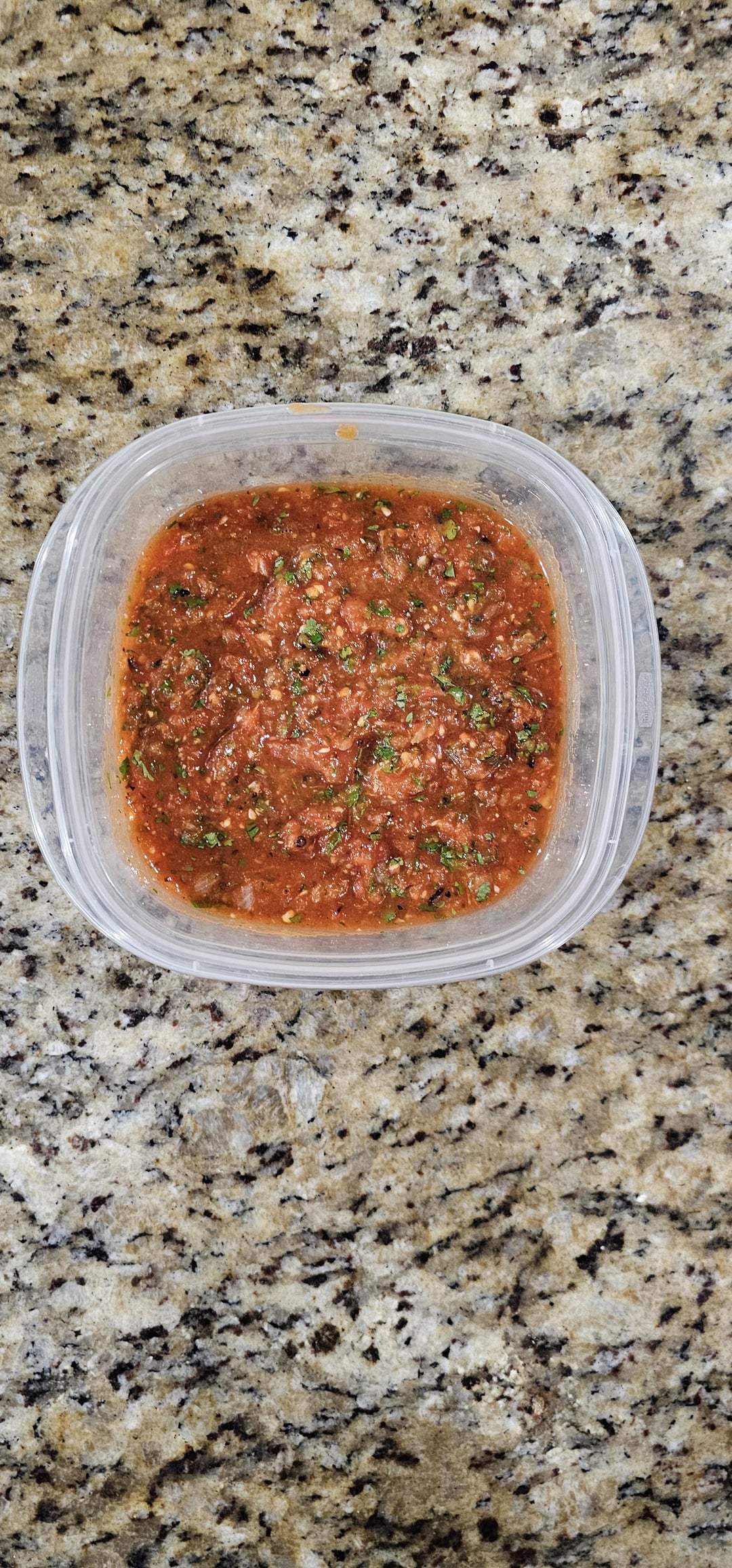 8 roma tomatoes, 1 white onion, 1 serrano, 4 cloves garlic, 1 cup cilantro, 1 lime, 1 tbsp tomato/chicken boullion