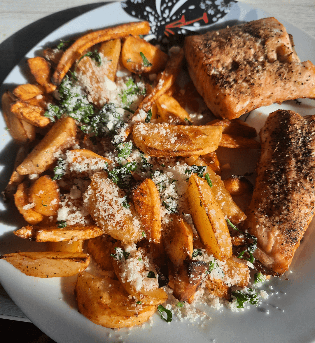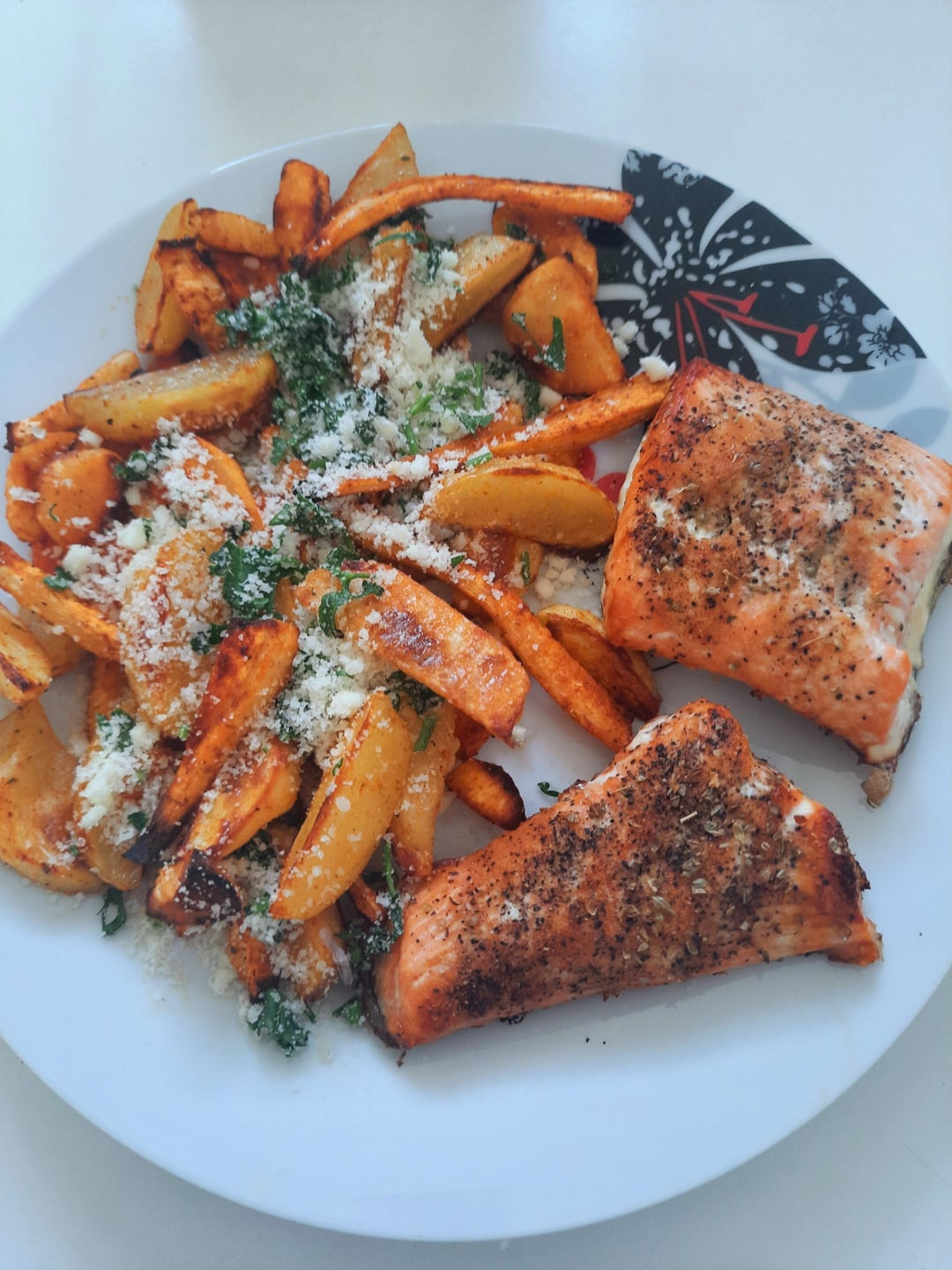 Beautiful! Everything looks perfectly crispy and well seasoned. Now I have a craving for salmon. I love potatoes, and the fact that all of the veg here look a bit potato-like makes them even more appealing to me.