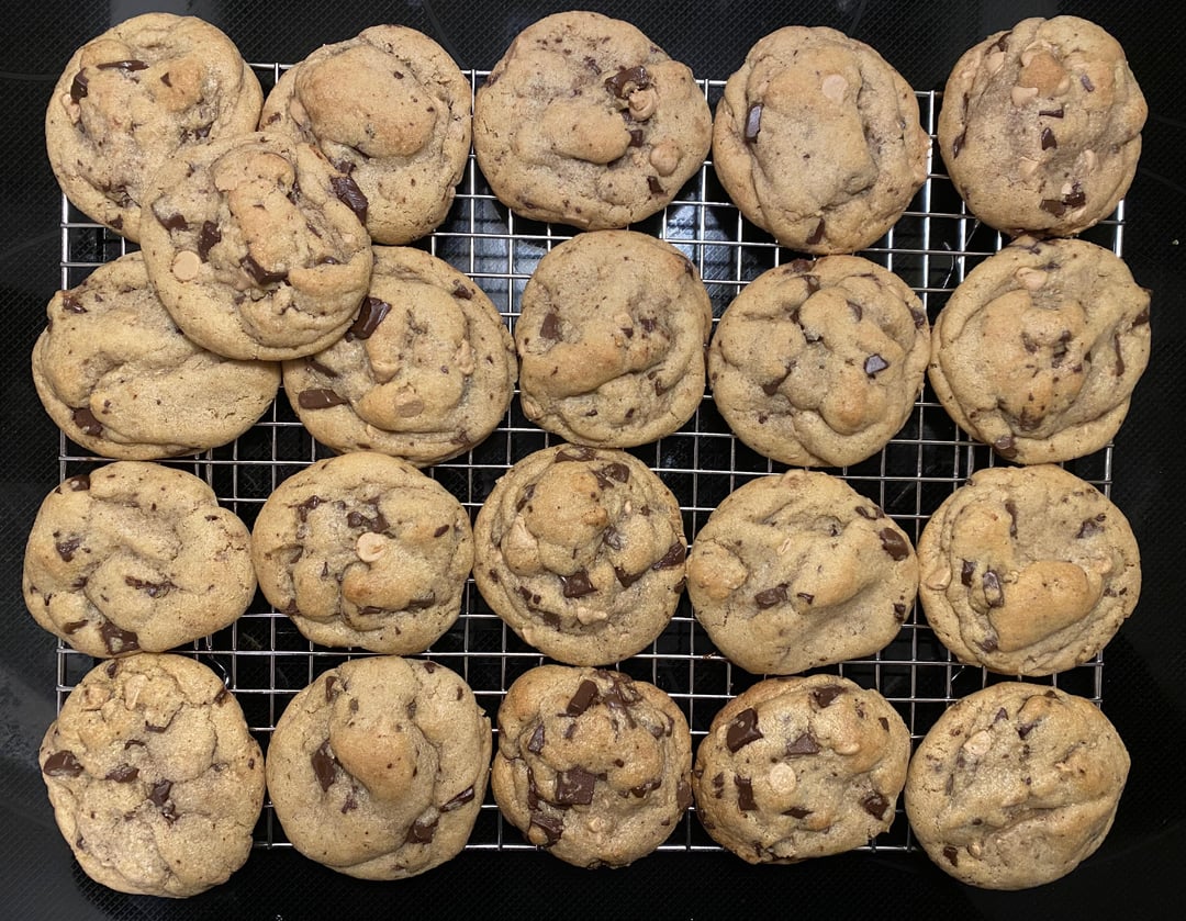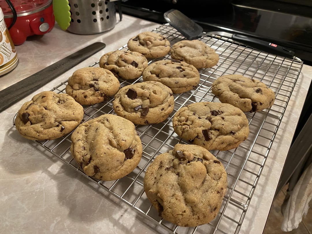 So excited right now, people. I’ve been making these cookies for friends, family, and coworkers for a few years. They’ve always been good, but I felt there was still room for improvement. Didn’t like how much they’d usually spread, I want ‘em thicker. Tried all the usual tricks. Wellllll…. This is it. I browned butter for the first time and hot damn, these are just incredible. Subtle difference in flavor, but the texture and thickness is exactly what I’ve been after.