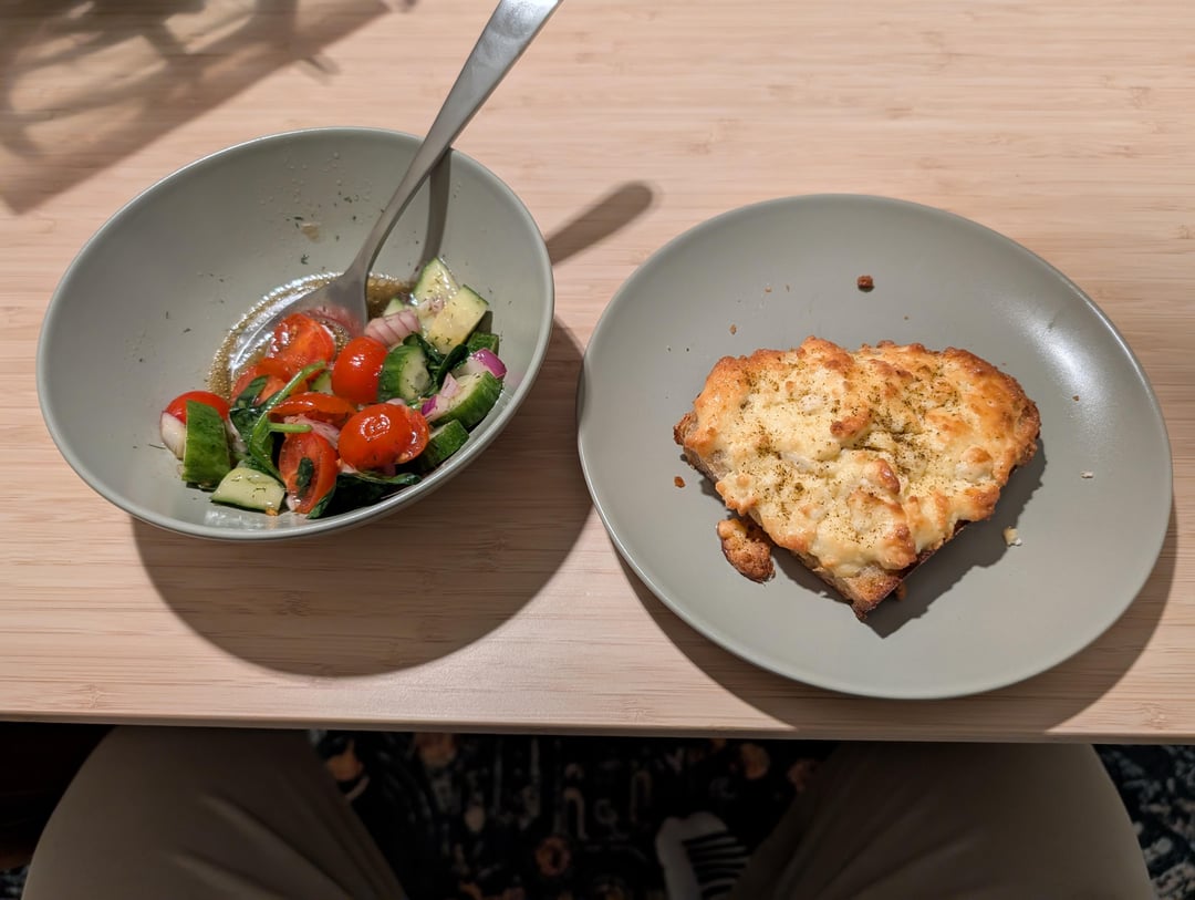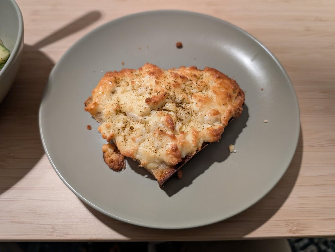 This one is a mixture of Feta, Egg, and Butter, spread on buttered toast, and sprinkled with Sharena Sol (Шарена Сол) (a mixture of salt, paprika, and summer savory) after baking.