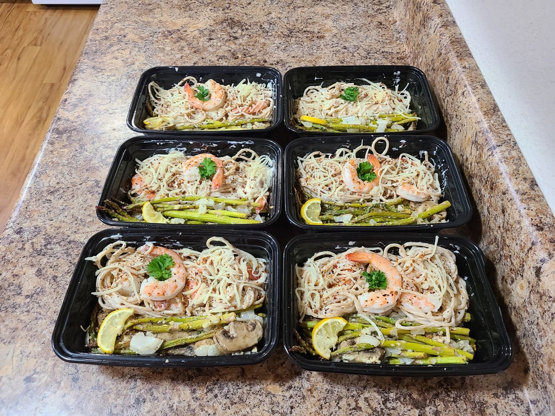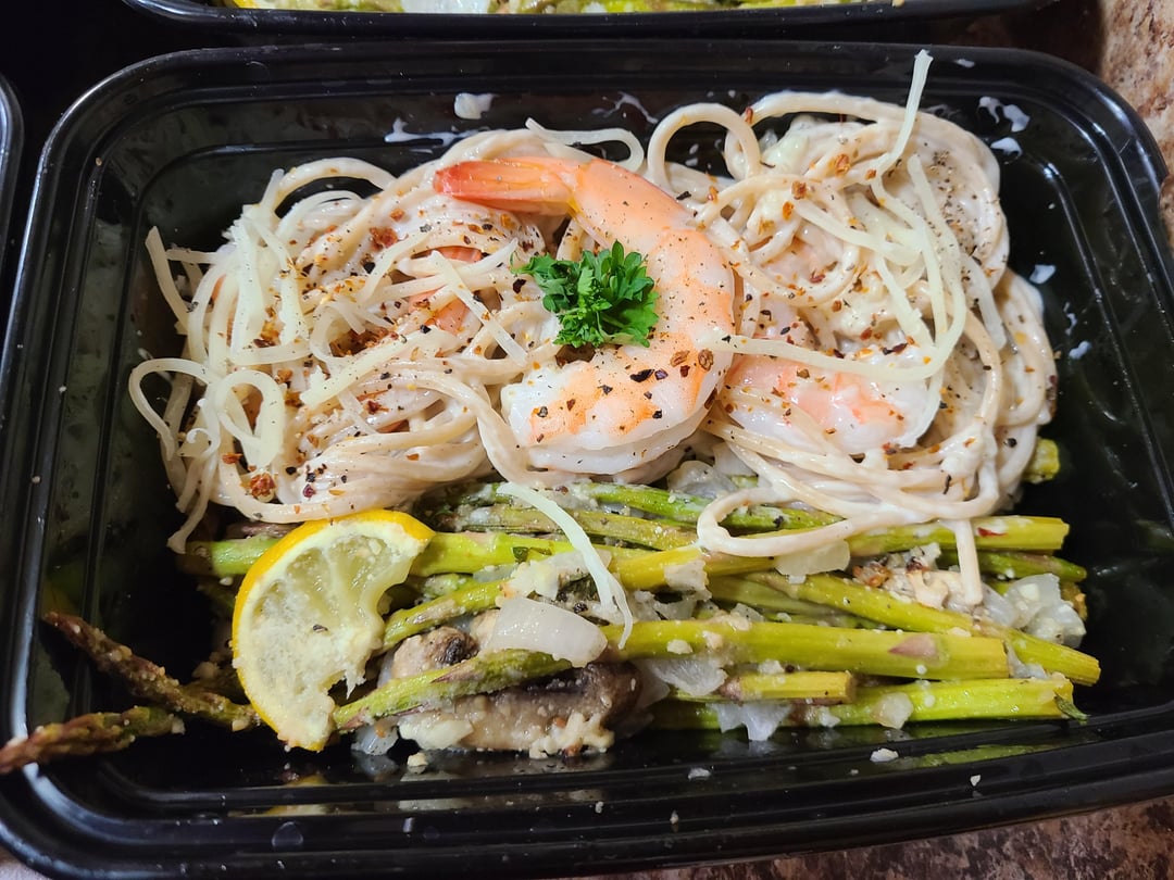 Dinners: oven roasted lemon-parmesan asparagus with onion, garlic and mushrooms. Whole wheat spaghetti with roasted garlic pasta sauce, shrimp and spicy red pepper flakes.