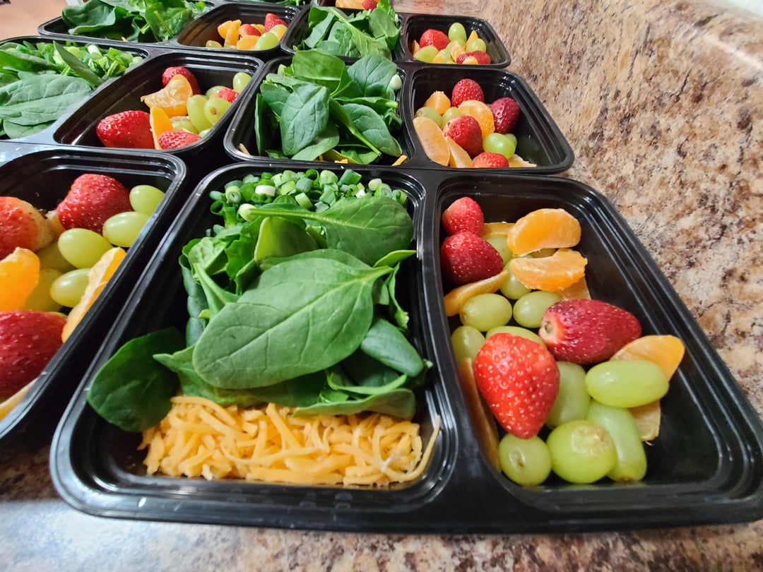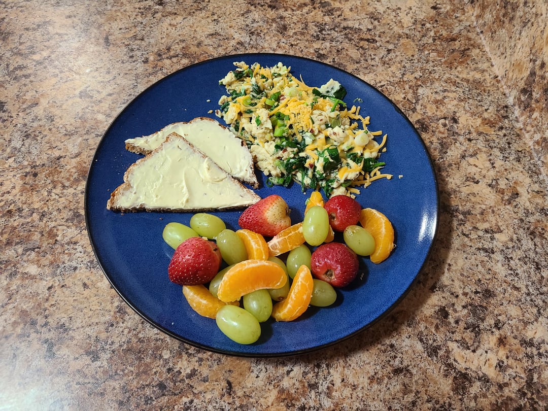 Breakfasts: baby spinach, green onion and fat-free shredded cheddar, I add this to scrambled egg/ egg whites each morning and make a thin slice of multigrain toast with light butter substitute. Side of fresh green grapes, strawberries and tangerine.