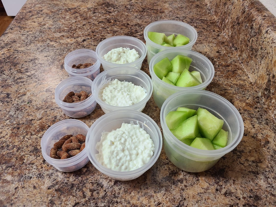 Midmorning Snacks: cottage cheese, honeydew melon and seasoned almonds. I also have collagen powder and almond milk in a coffee with this meal.