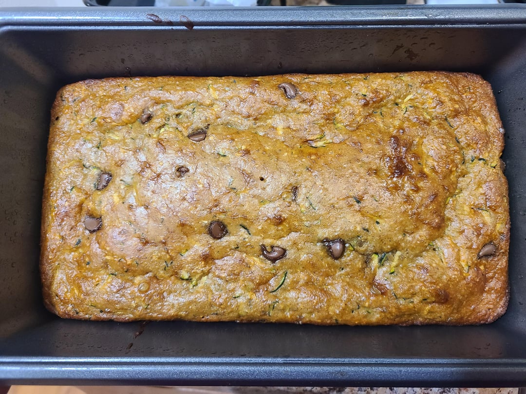 Mix your wet ingredients and dry ingredients separately, slowly add wet ingredients to dry. Fold in chocolate chips, nuts, etc. Bake in a pan sprayed bread pan at 350° for 35 minutes or until a toothpick comes out clean when poked into the center.