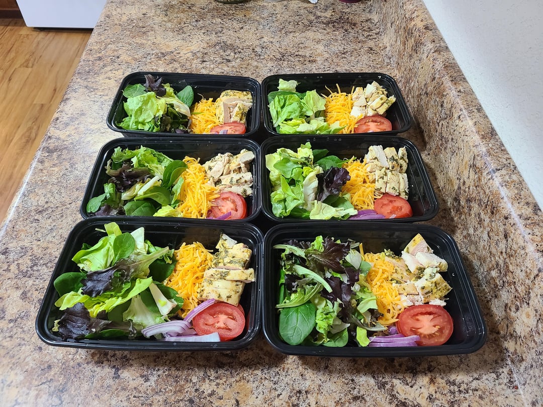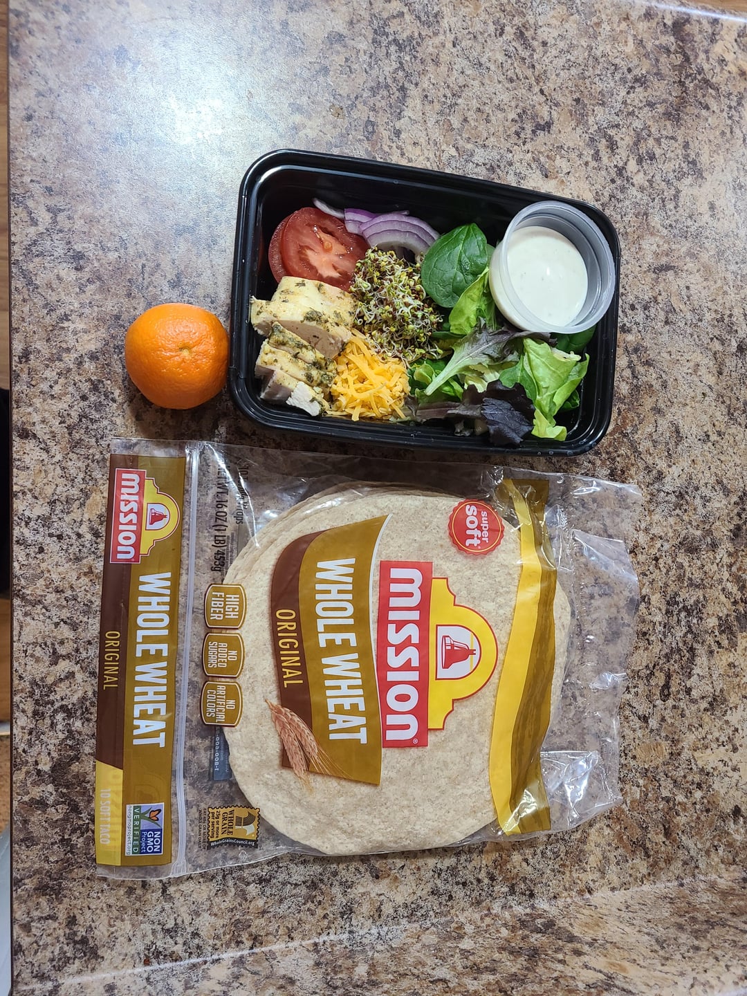Lunches: wraps with marinated and baked garlic herb chicken breasts, butter lettuce, baby spinach, tomato, red onion, fat-free shredded cheddar and homegrown broccoli sprouts. Side low-fat Ranch dressing, a whole wheat tortilla and a tangerine.