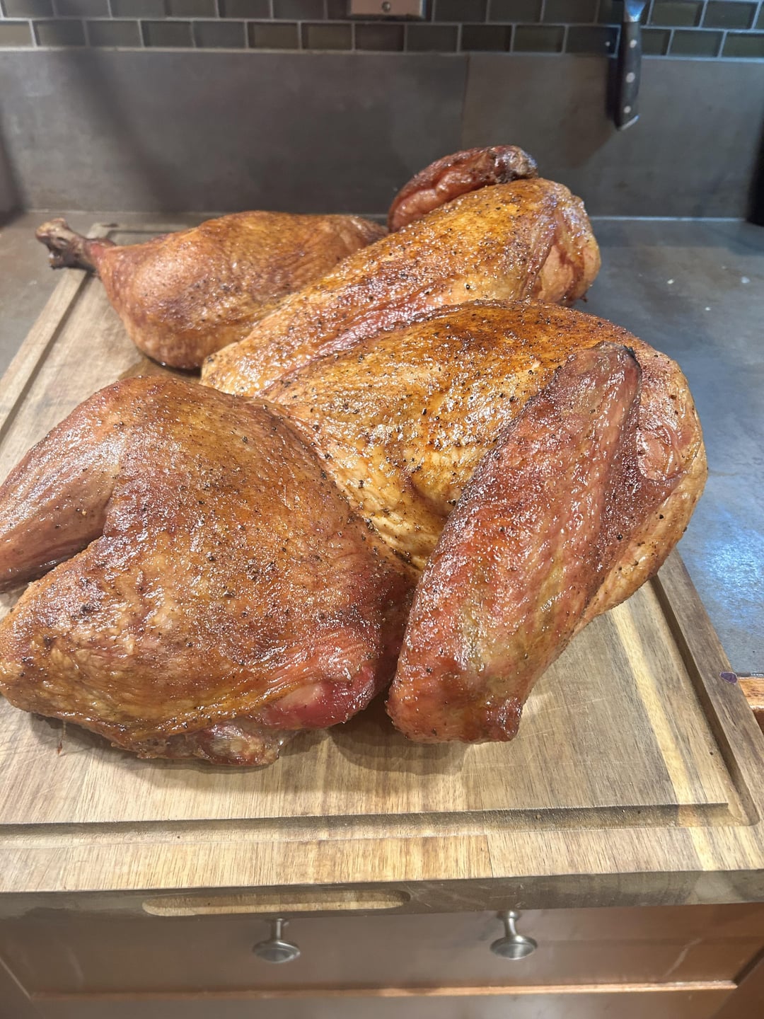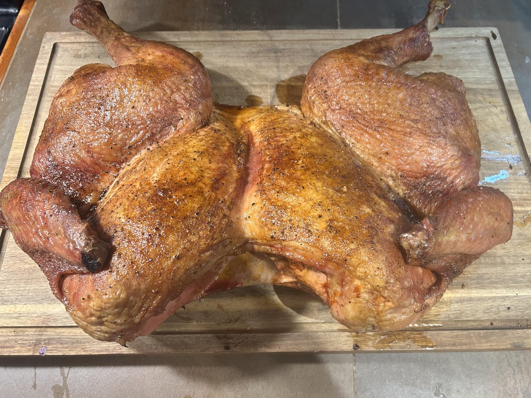26 lb big boy lol. Brined overnight in Brown sugar, bourbon, maple syrup and kosher salt. Smoked 7 hours at 225, seasoned with Meat church Texas sugar rub. Glazed with a mixture of Butter, bourbon and Maple syrup every hour.