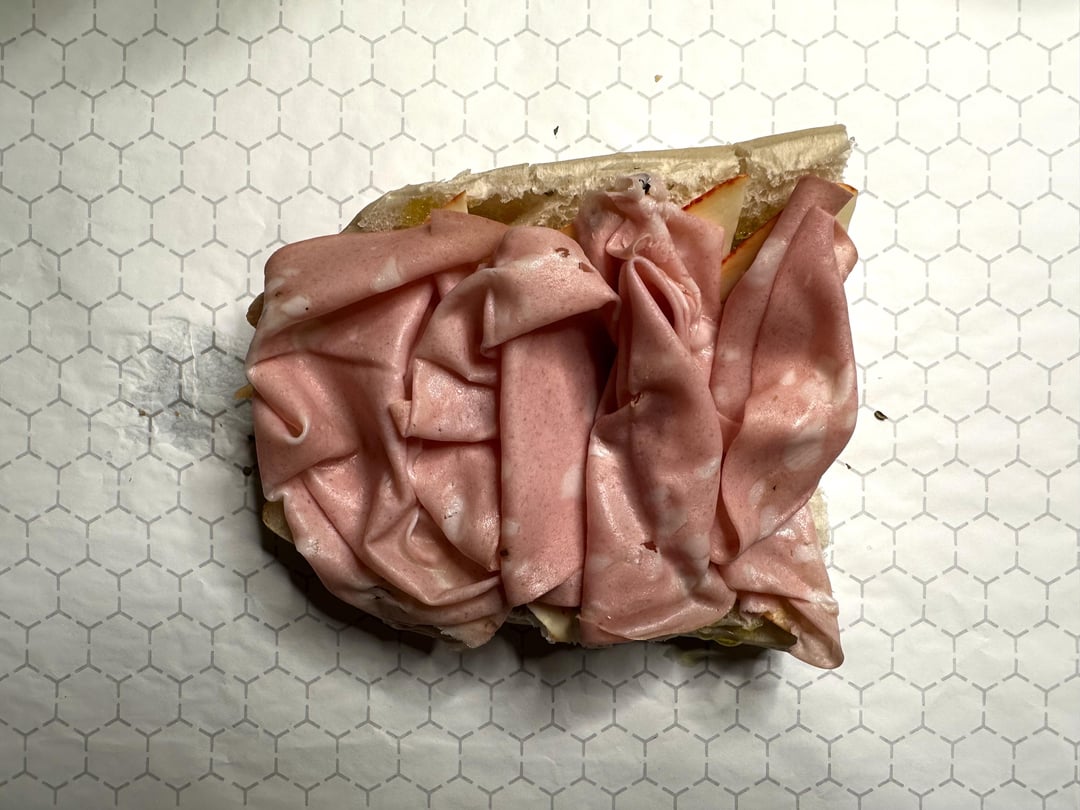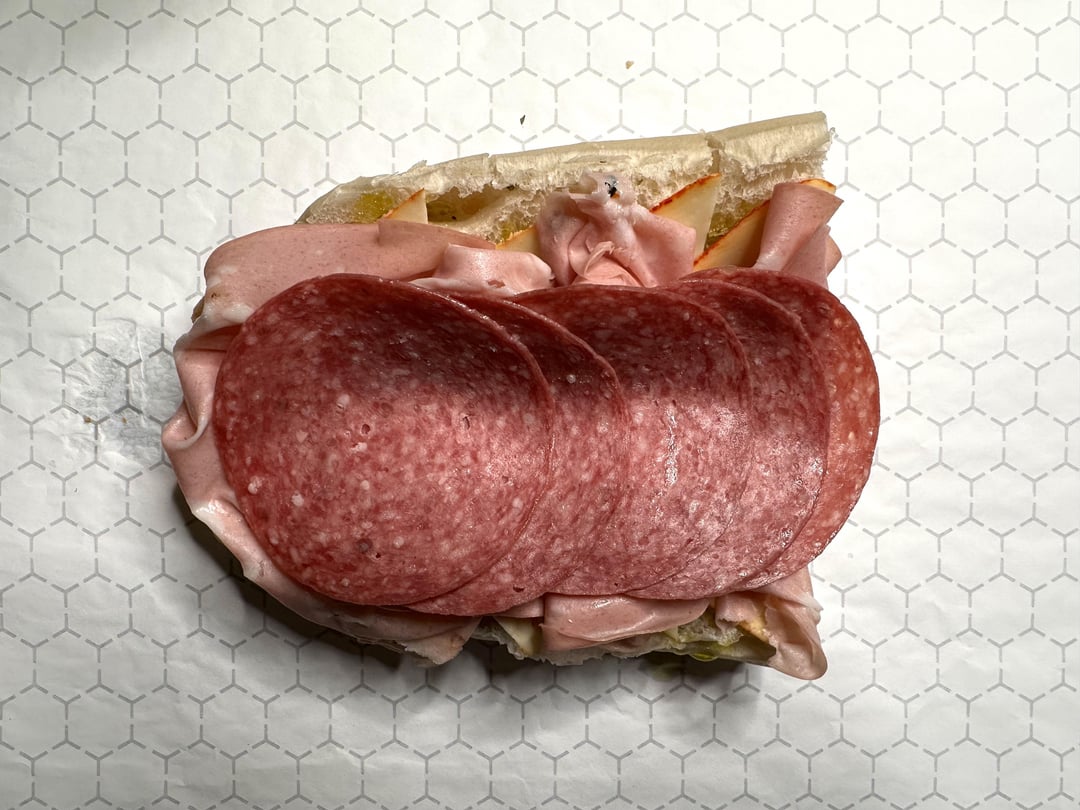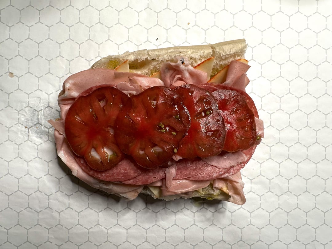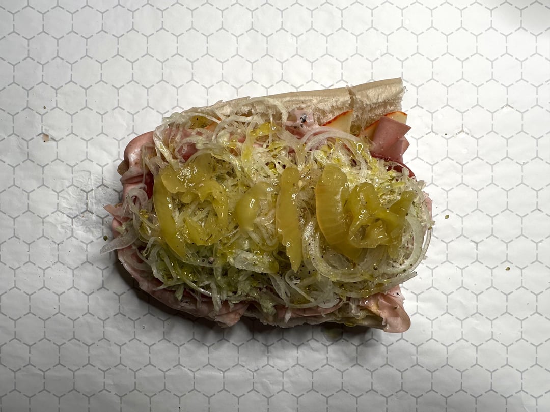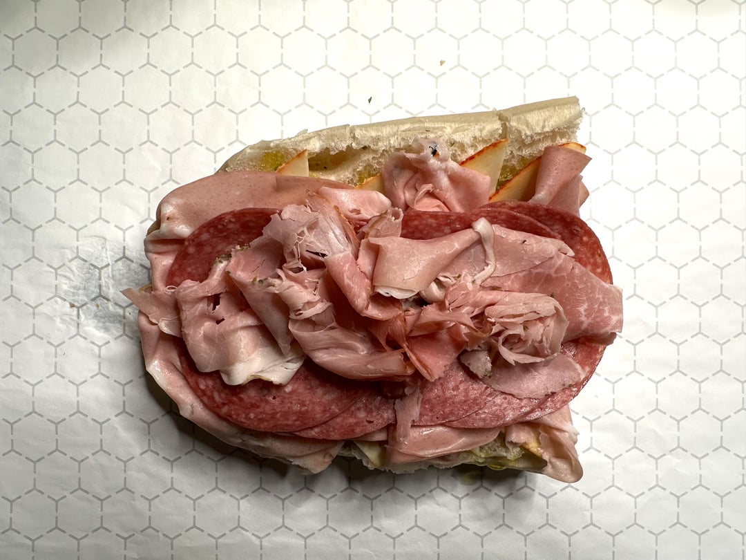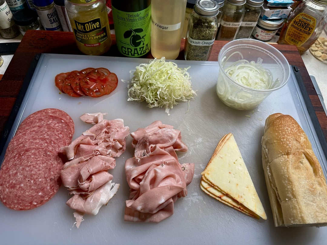 Mortadella, hard salami, rosemary ham, Muenster, shredded lettuce, tomato, shaved onions, pickled peppers, oil, vinegar, salt, pepper, and oregano.