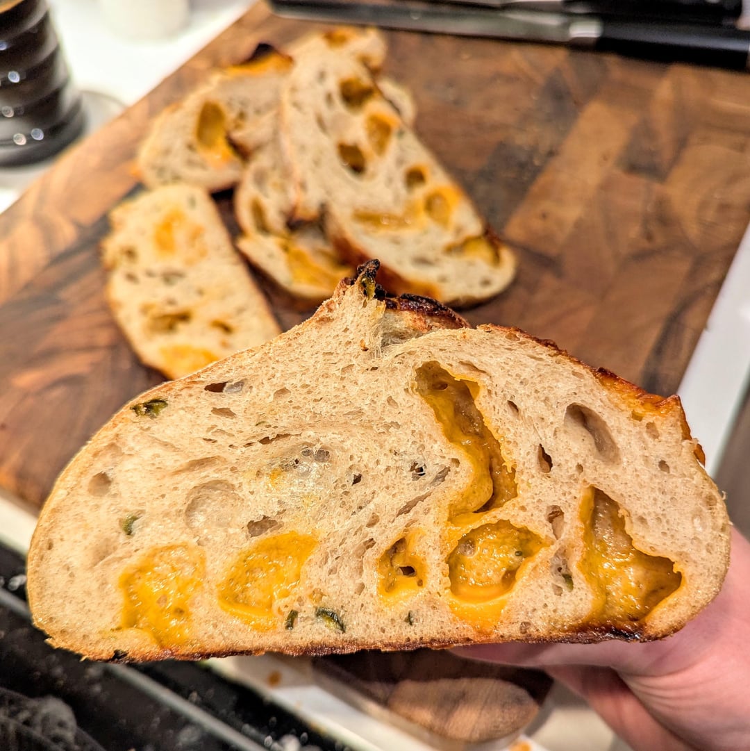 Sauteed the jalapeno in good olive oil and added all of it, oil included, to the dough. Incredible pepper flavour all through it. Added an irresponsible amount of cheddar during the stretch and folds.