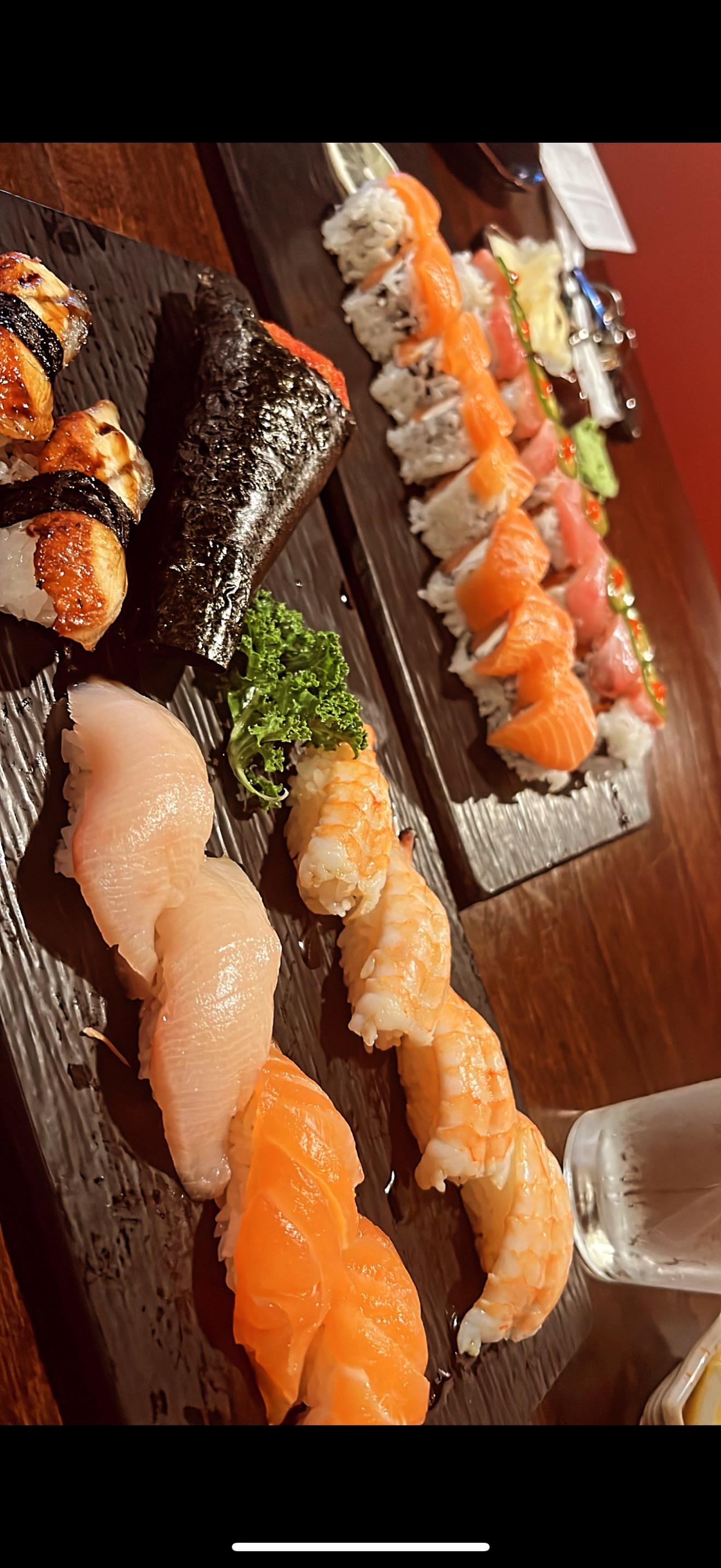 Sushi cut rolls, hand roll, and nigiri