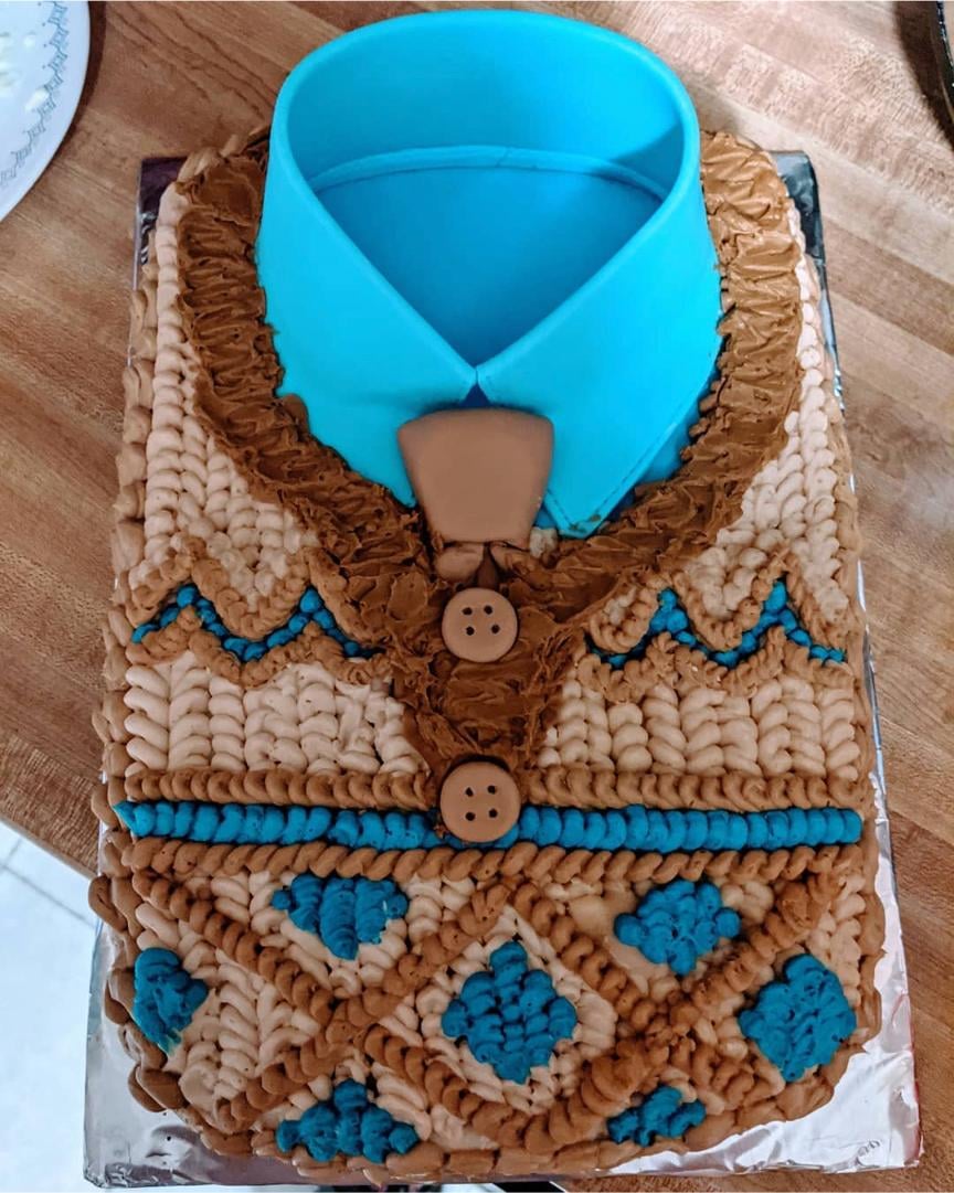 This was my first (and one of my only) escapades into fondant. Used fondant for the shirt collar/tie/buttons and did SMBC for the remaining details. This was a birthday cake for my dad, as he's well known for his shirt and cardigan combos.
