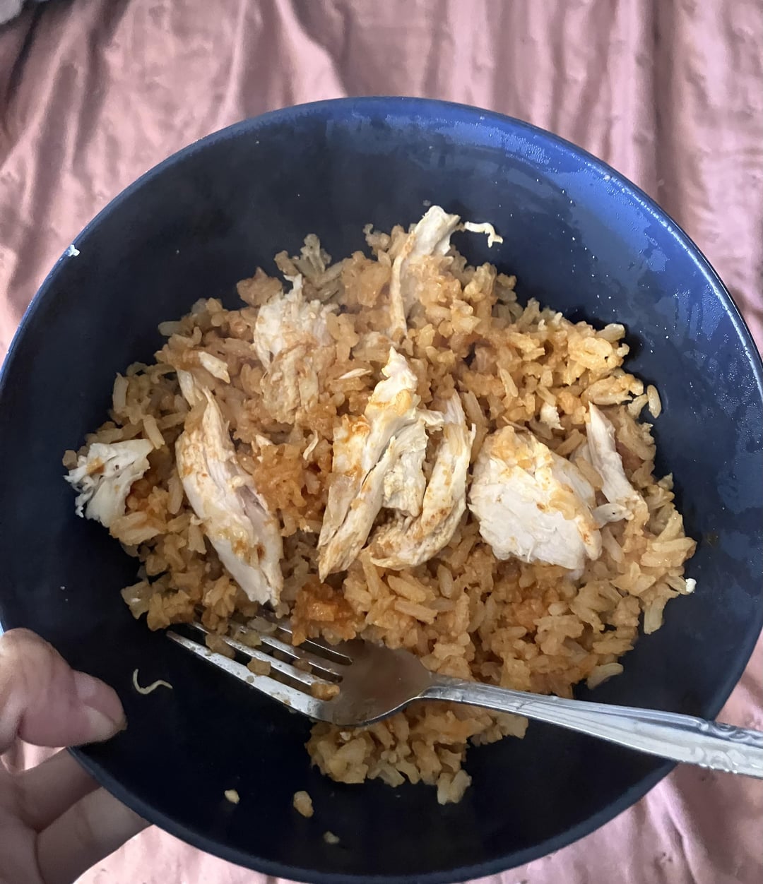 My grandma made the rice so idk exact measurements besides tomato sauce, bit of vegetable oil and chilé and seasoning. Chicken was a premade rotisserie bake I bought, no calories were on the bag.