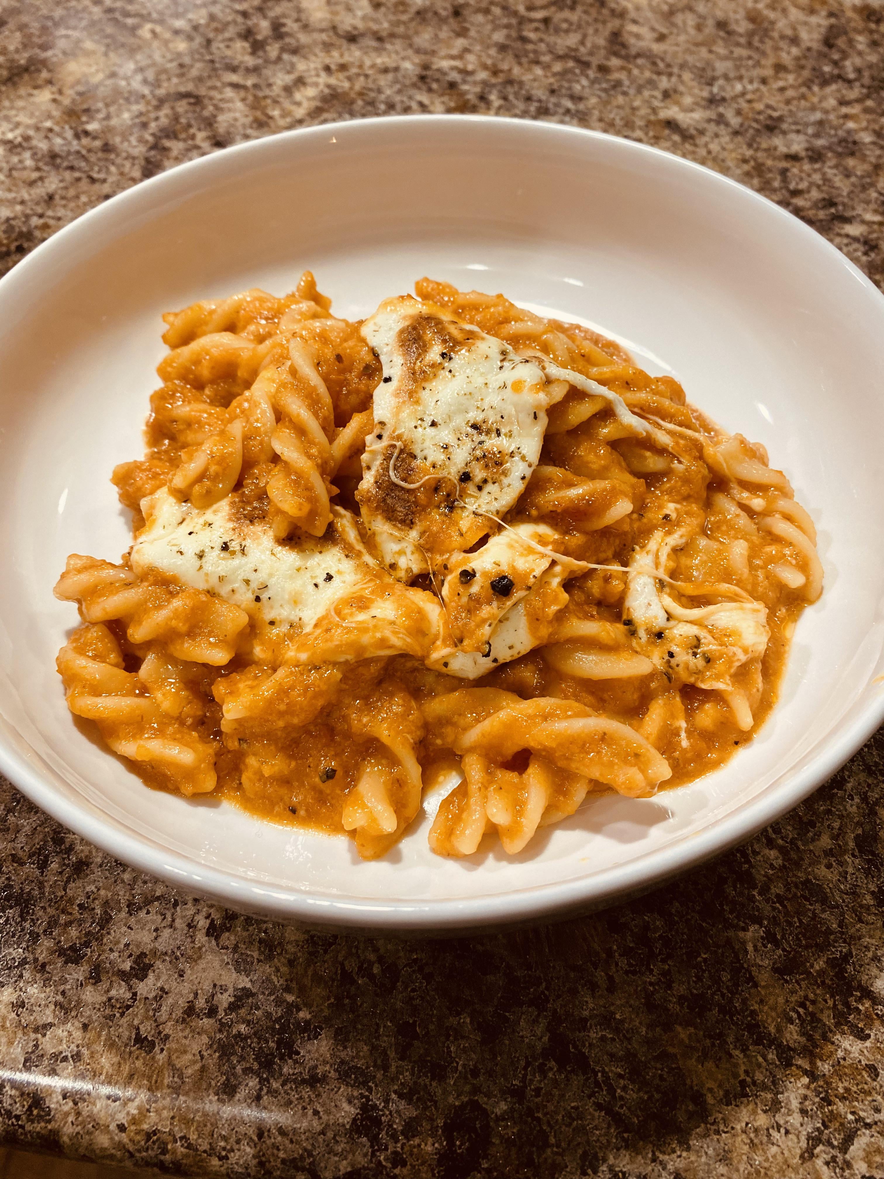 would definitely add meatballs to this next time. roasted some tomatoes onions red bell pepper and garlic for about 45 mins at 425 degrees, then crushed everything and blended it into a sauce and added Italian seasoning with salt and a little pepper. add any seasonings you like. keep tasting to make it to your liking. then put pasta and sauce in a baking dish and put mozzarella on top, baked for about 5-10 mins or until cheese was melted and golden. delicious
