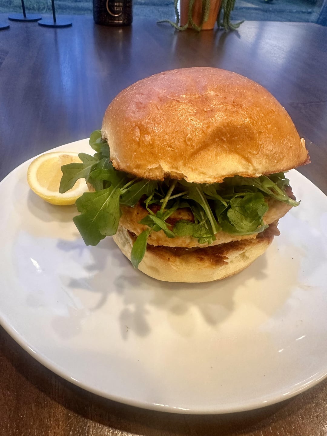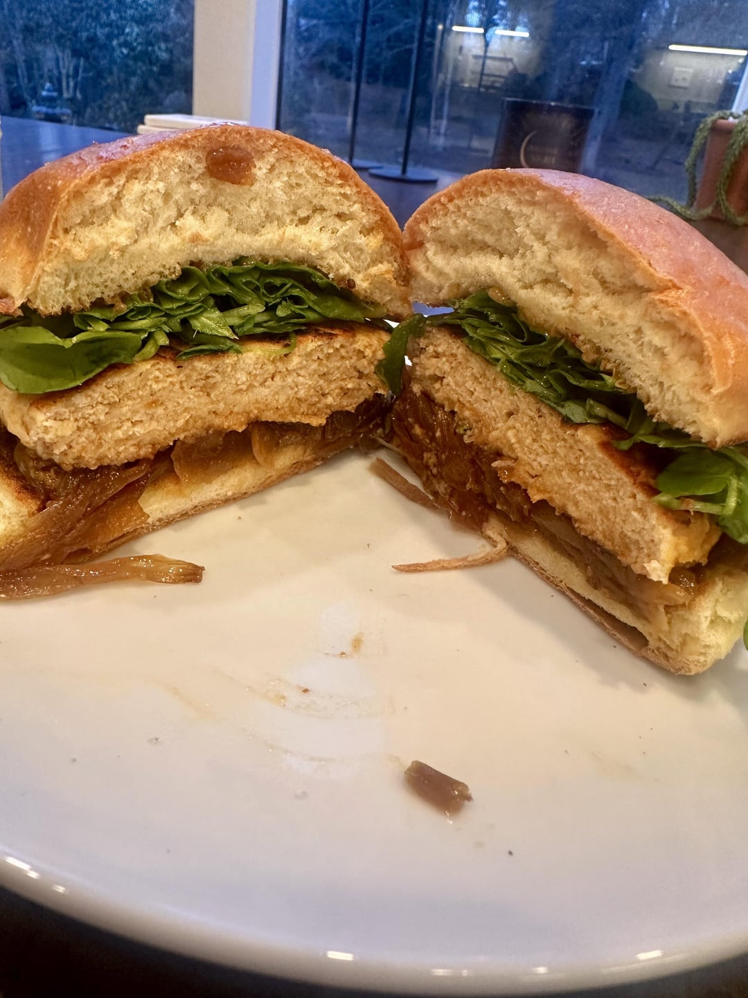 These were pretty good! I caramelized the onions instead of doing that grilled thing, just because I like mine softer. And I put the mixed greens salad that was sent to be the side dish onto the burgers themselves for some freshness.