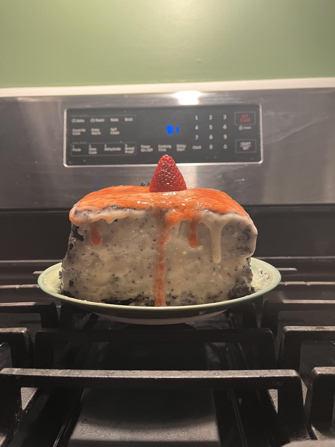 That way you have solid frosting. You get your cream cheese flavor. Strawberry incorporated. Nice decoration.