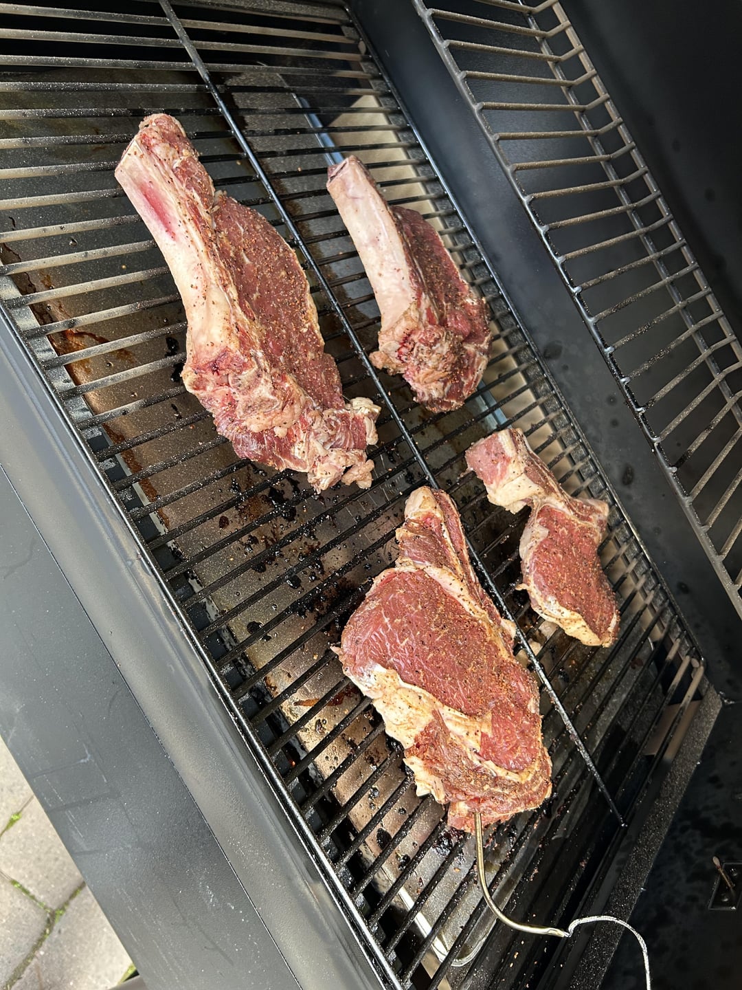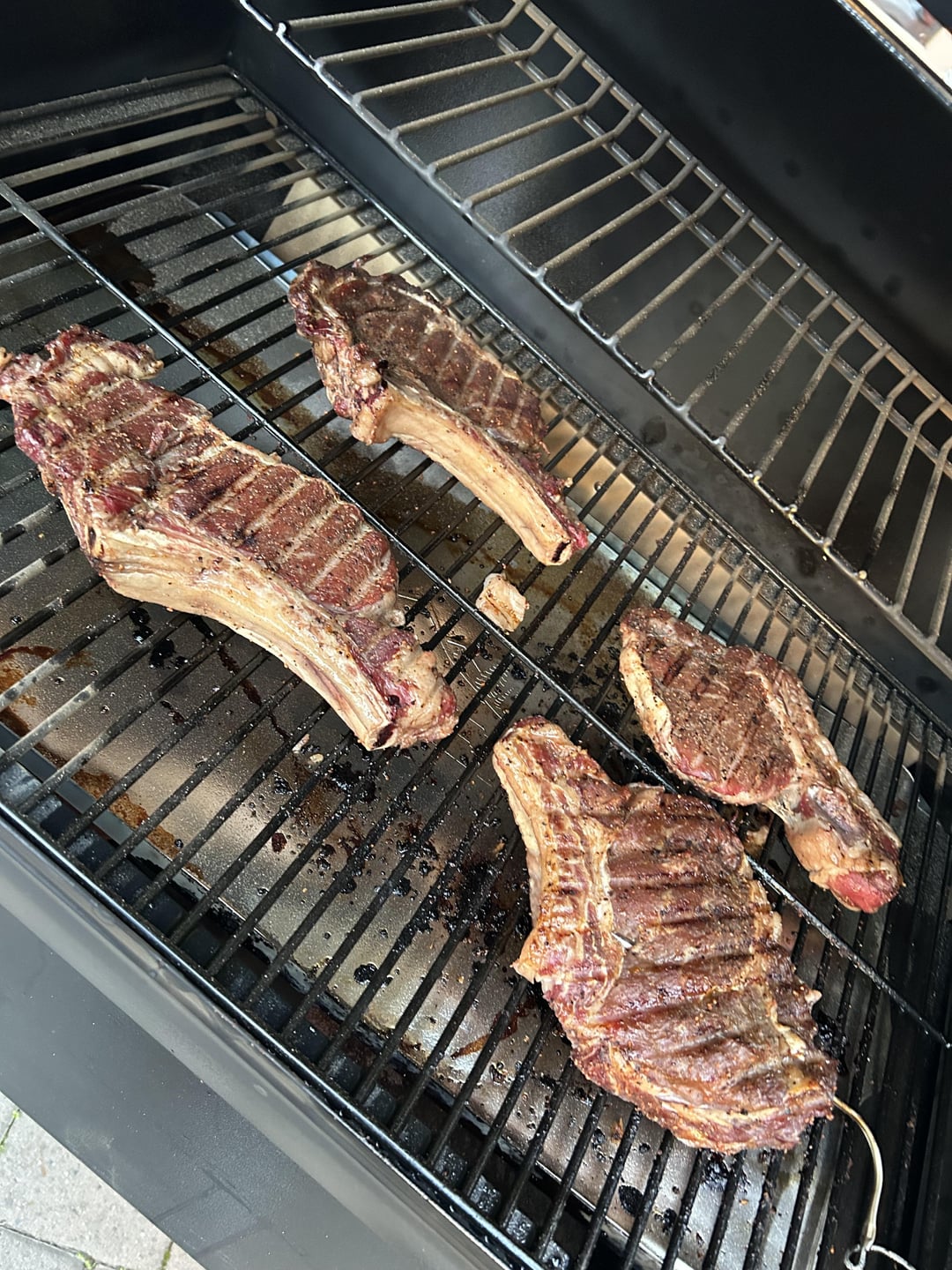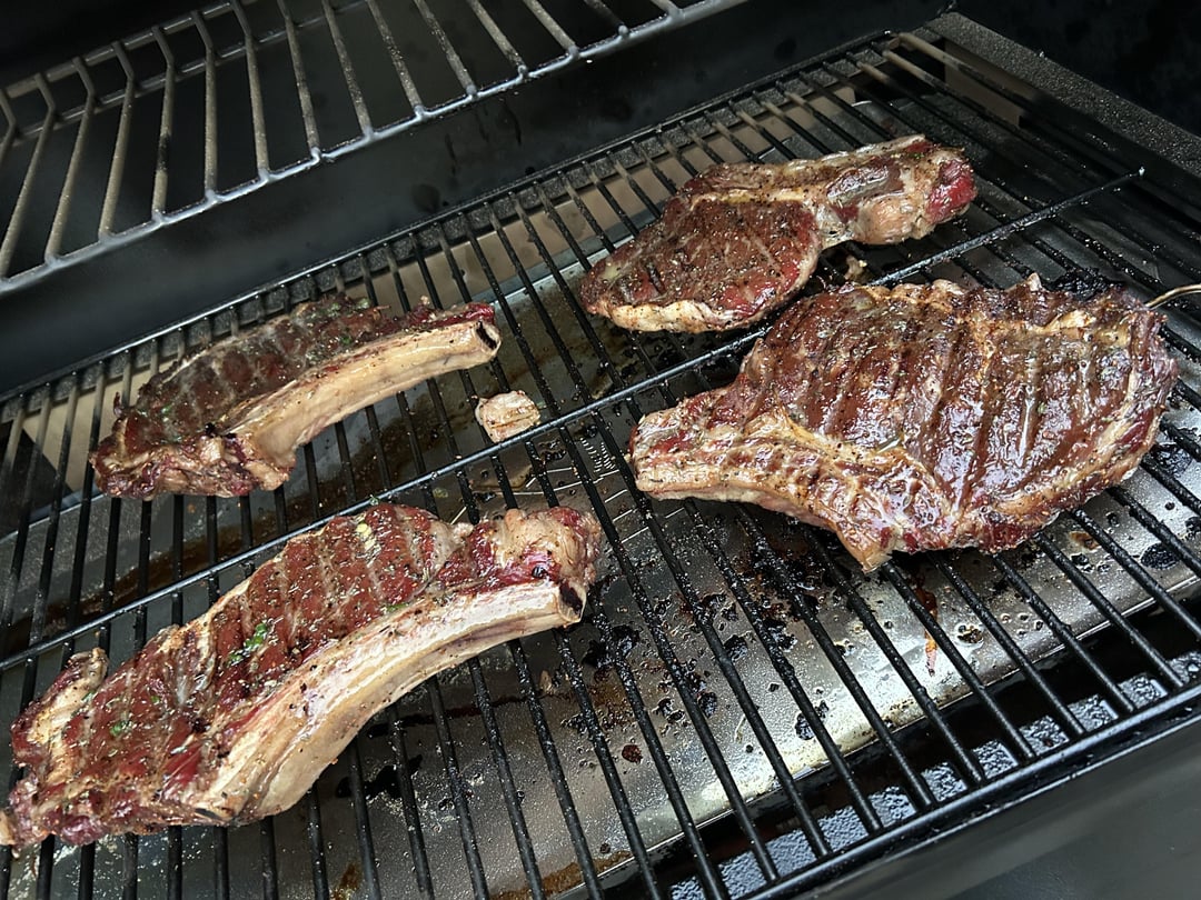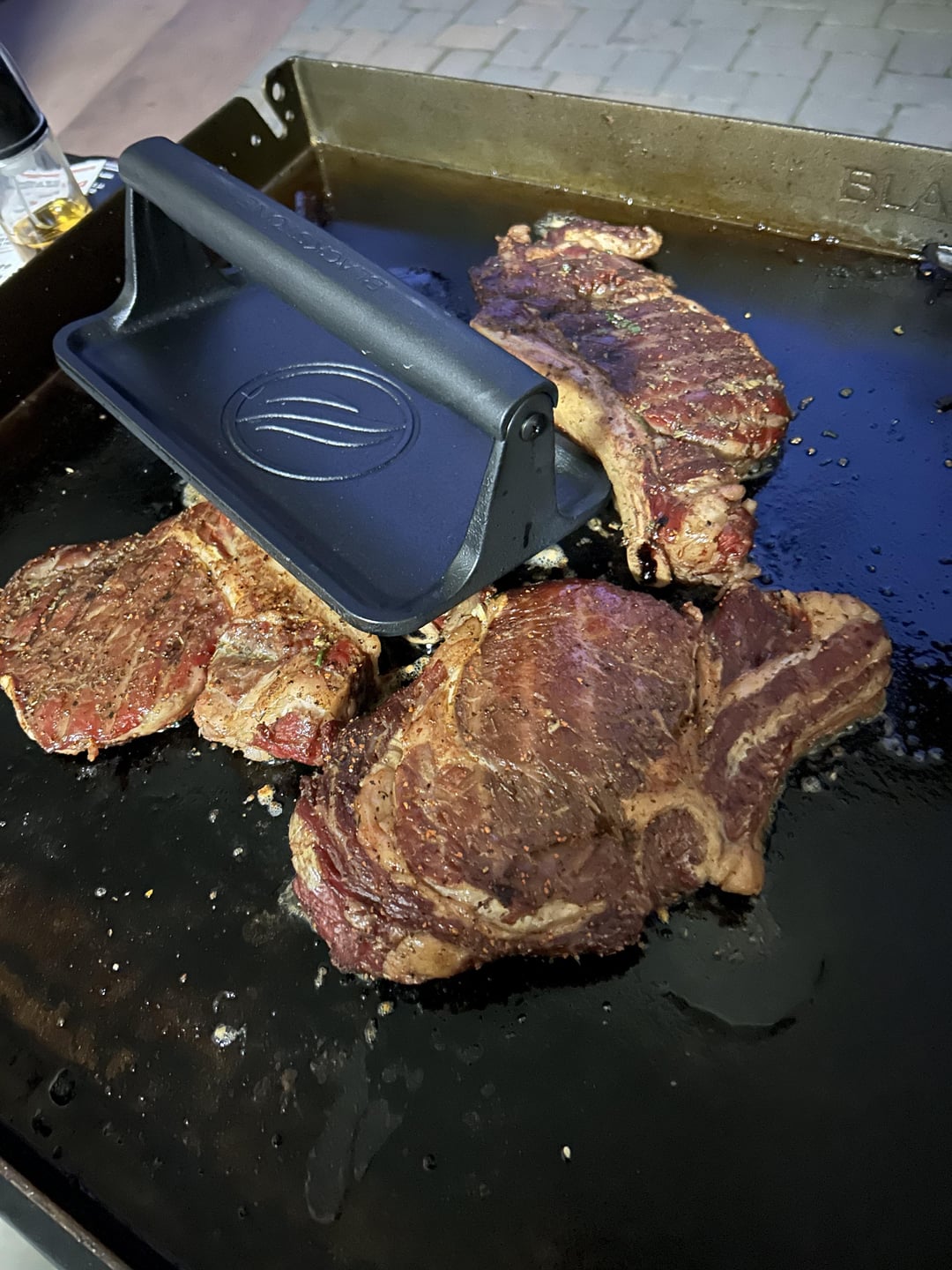 I smoked them to about 115 degrees the I put them on the blackstone to sear them with that griddle press.