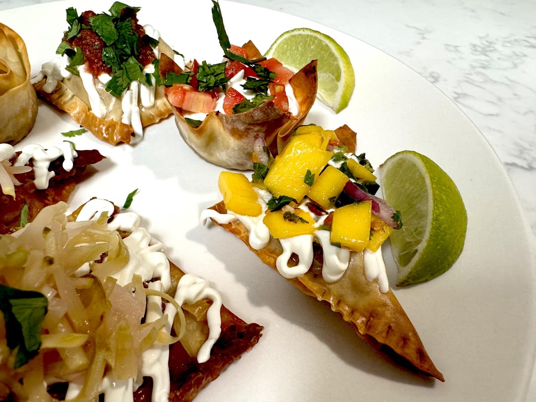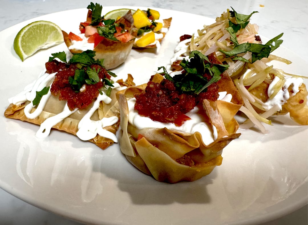 There are two types of cup tacos. One is a single layer: wonton wrapper, refried beans, meat, cheese. The other one is doubled in the same cup, including the wonton wrapper.