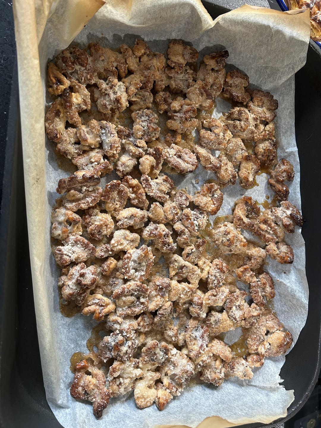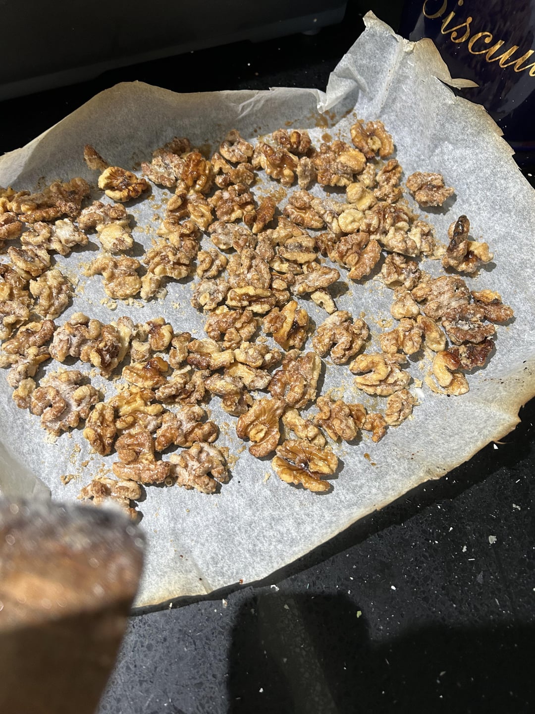 Walnut halves give them a rinse and place in a mixing bowl. Dry them off a little but you do want them somewhat damp so that the caster sugar sticks. Give them a good coating of caster sugar. Place on a baking sheet/roasting tin. Gas mark 7. Cook for 5 mins and give them a turn. 2 more mins in the oven and done.
