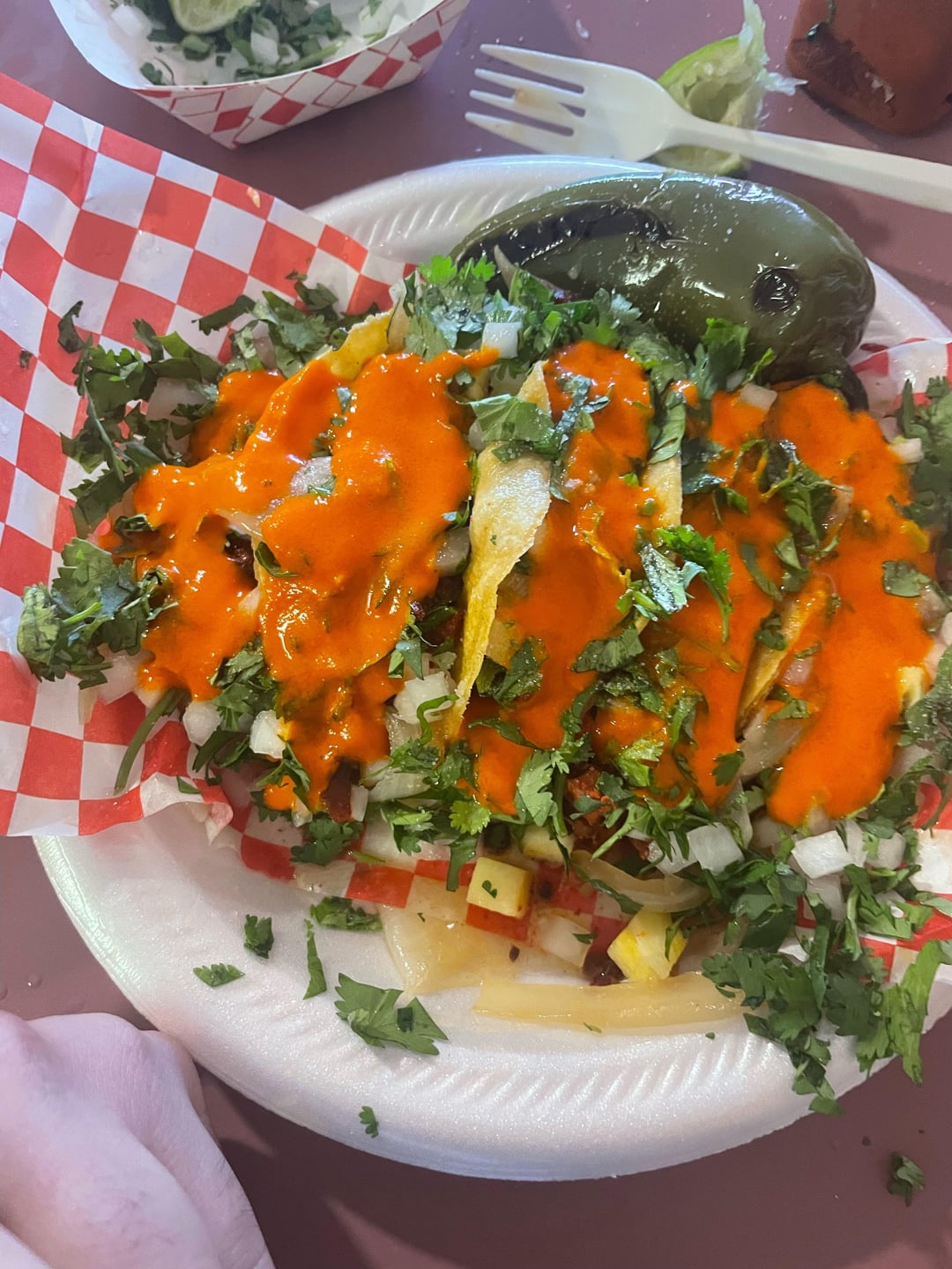 Here we have an order of Tacos de Trompo estilo Monterrey(where the owners are from). Don’t judge me for the amount of pineapple I like on mine 😎