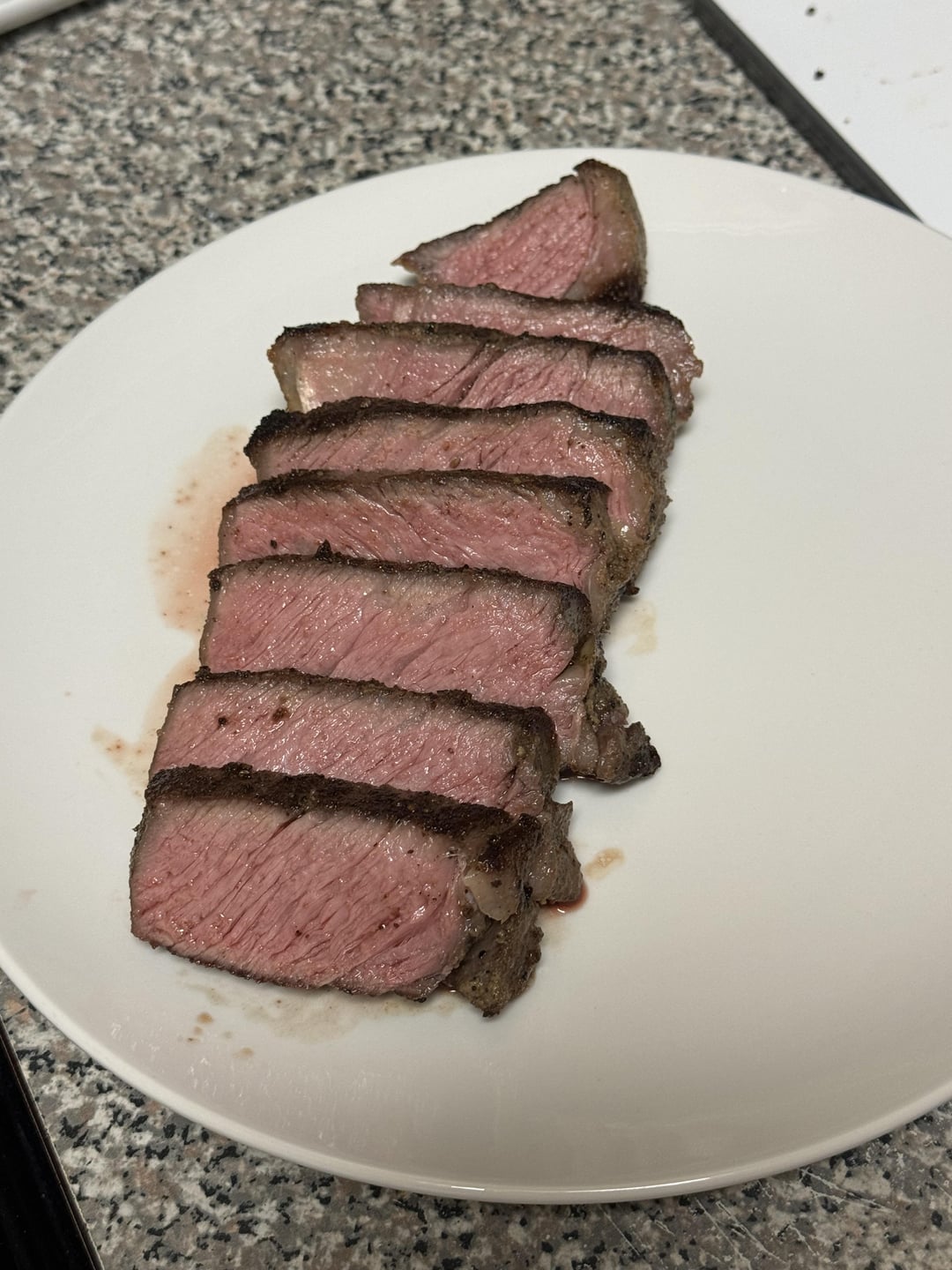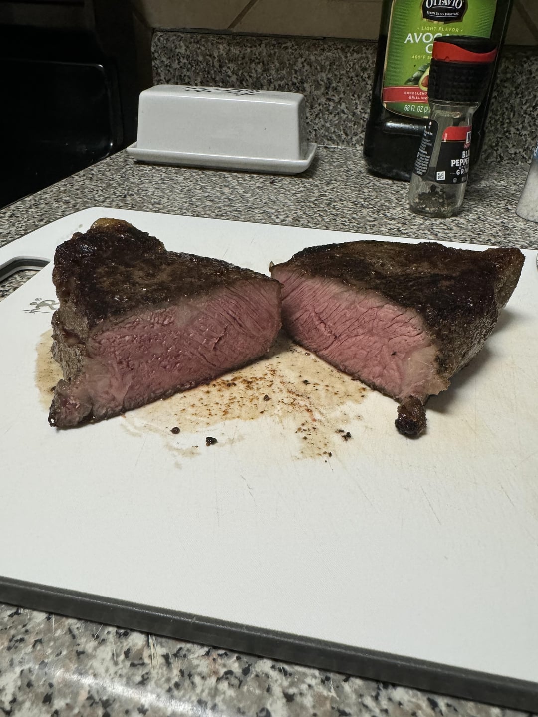 Great first attempt. Right down the temp in time to cook this one at, I would go 134 for the same amount of time. And give it a little harder sear maybe about a minute on each side create a great crust. Try like that write that down and see which one you like before or after. Maybe somewhere in the middle is the perfect spot for you. Remember when you’re cooking different cuts of meat the temperature will affect them slightly differently. If you’re cooking the ribeye you want to go for a little bit longer cooking time to ensure that some of the fat and sinew breaks down. If you’re cooking something like a filet you want to not go over 135° internal because by the time you see it you’ll get overcooked ring around perfect medium rare. And also when searing at the end ad a spring of time Rosemary and the smashed clove of garlic with about two tablespoons of butter and using a spoon based in the steak to give an extra layer of flavor and also assist on creating a great crust.