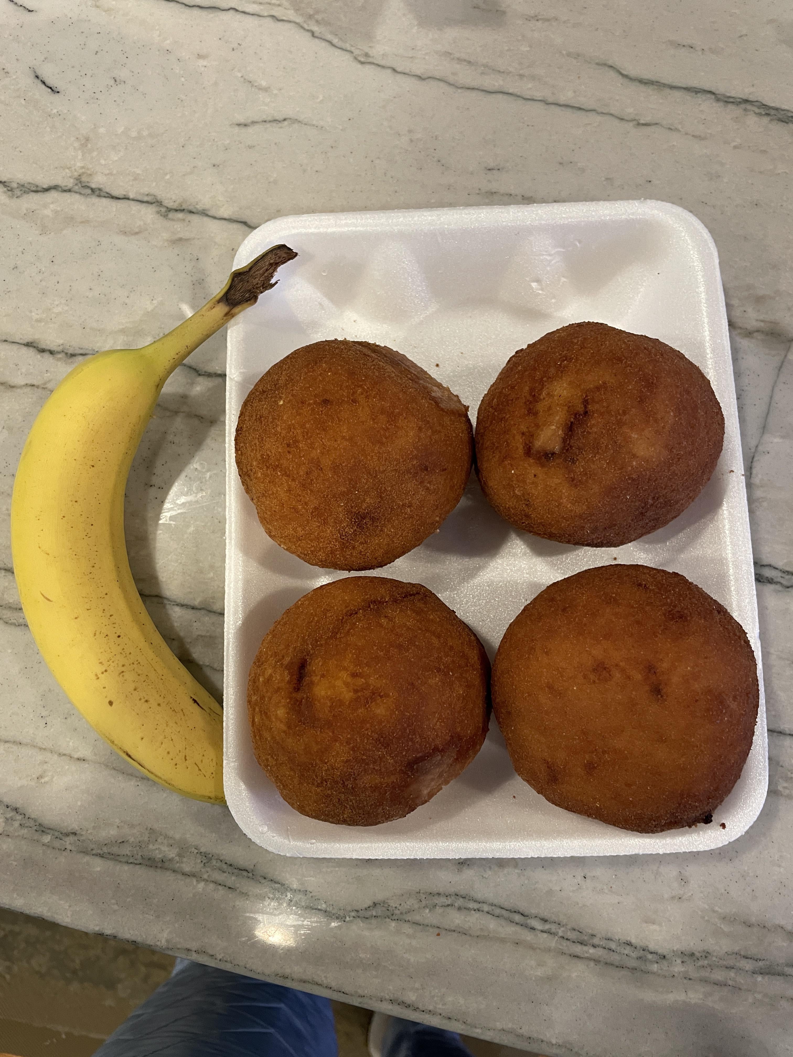 I didn’t check the price first ($3.50/ ea), and I assumed they’d be small. They are baseball-sized and stuffed with meat and cheese (banana for scale).