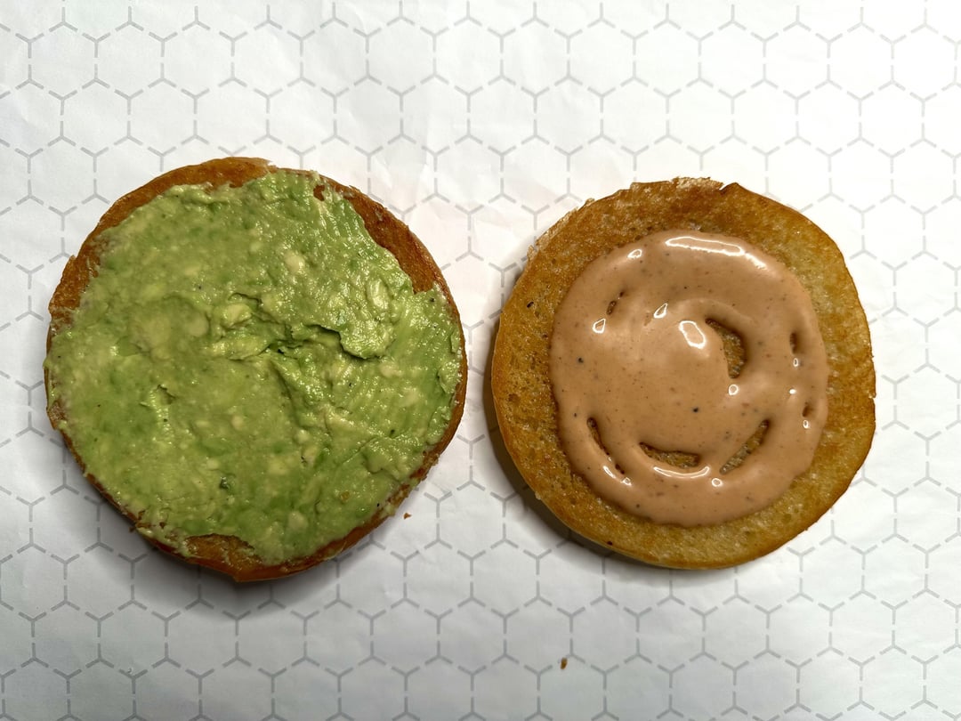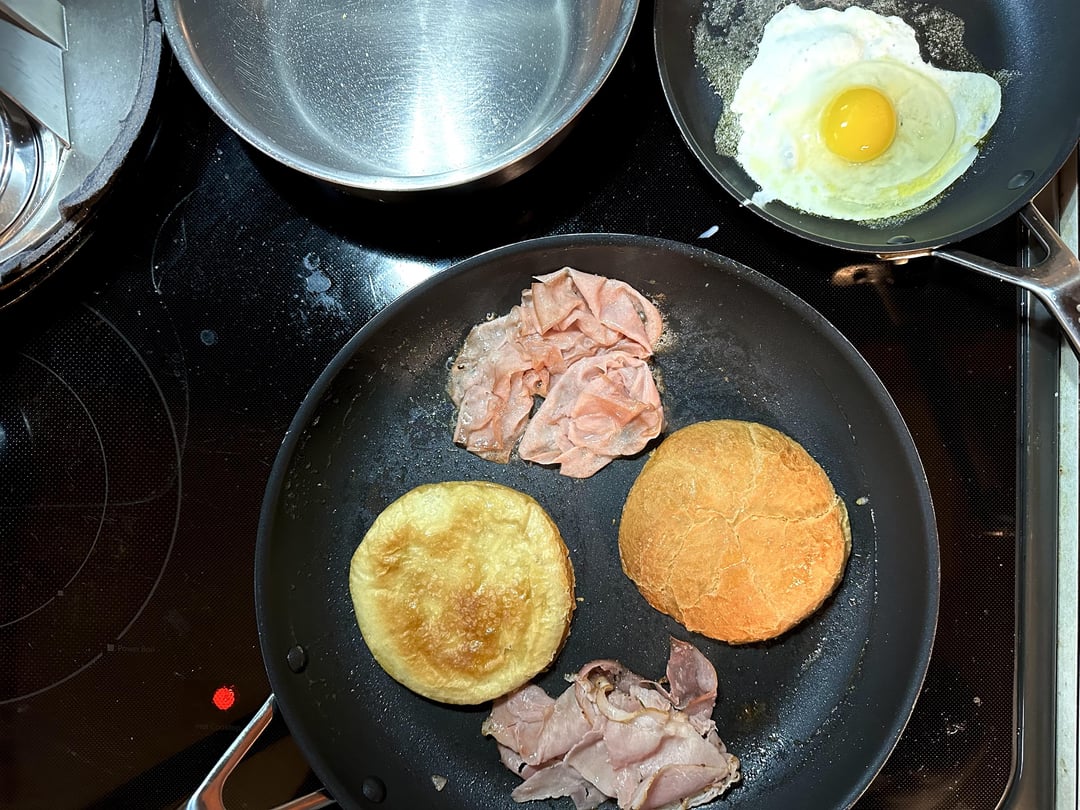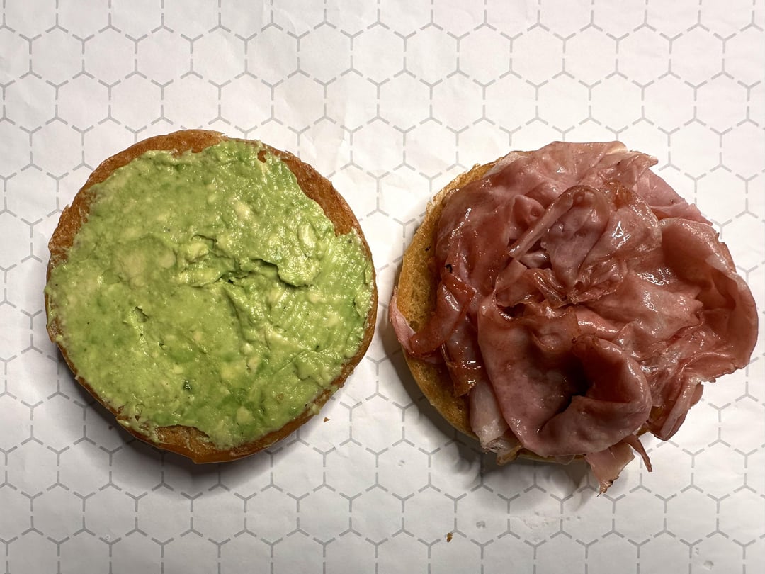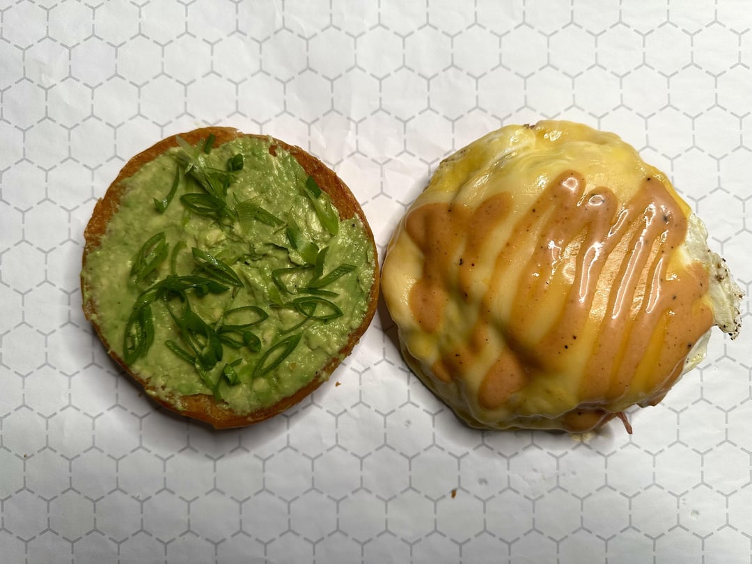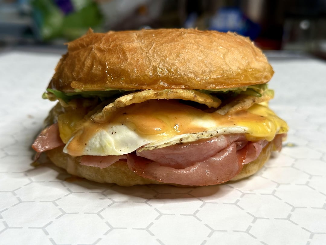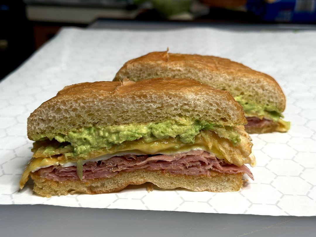 Over-medium egg, pan-fried super-thin mortadella, American and smoked Gouda cheese, scallions, my homemade burger sauce (good on almost everything) smashed avocado, and some crinkle malt vinegar potato chips, all on a buttered and griddled Italian sandwich roll.