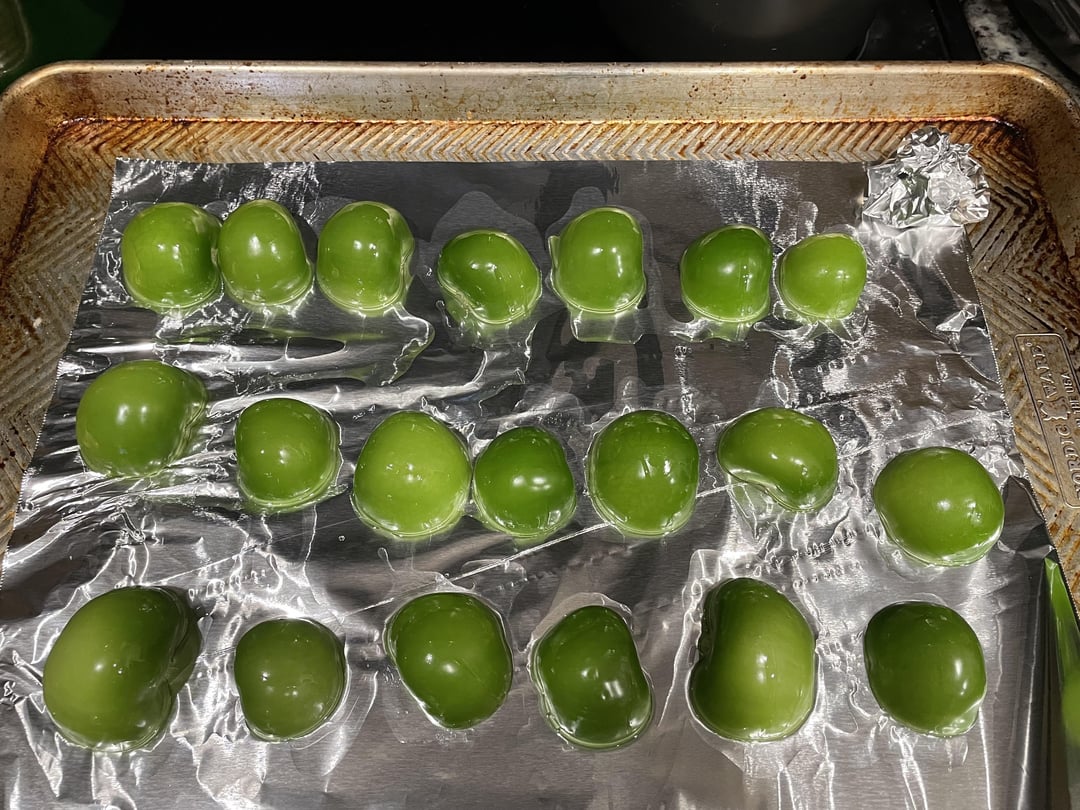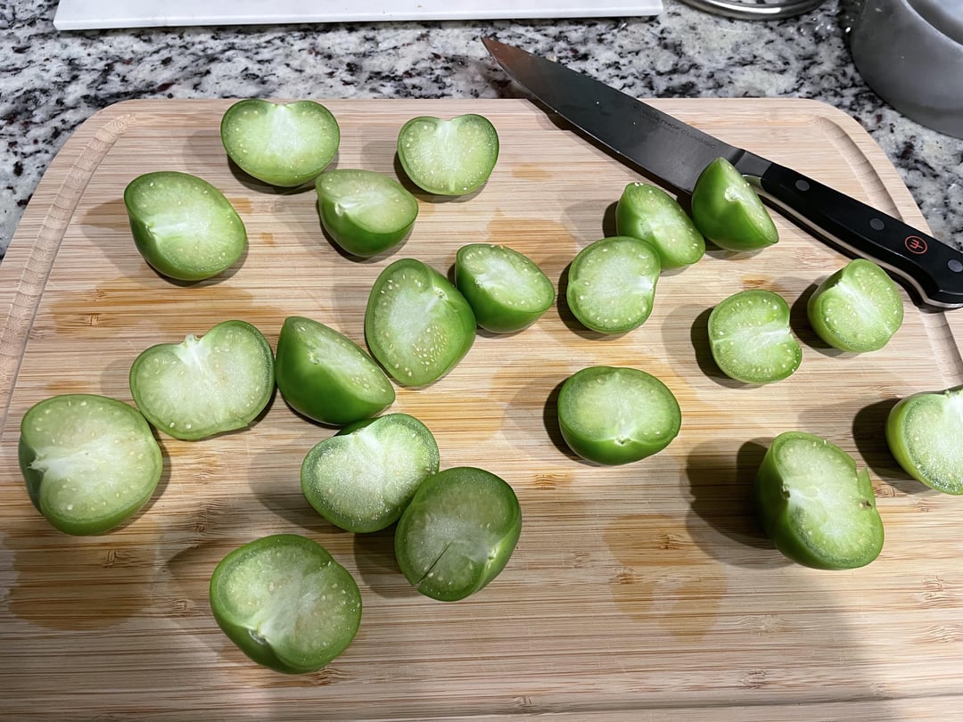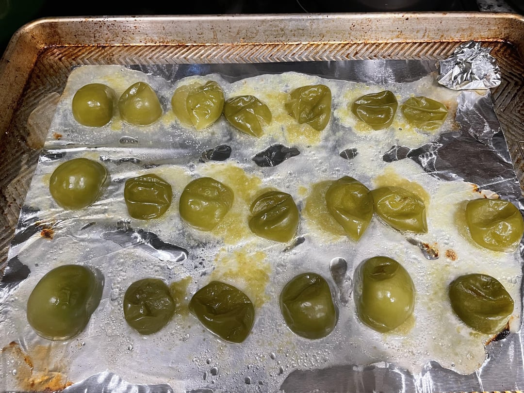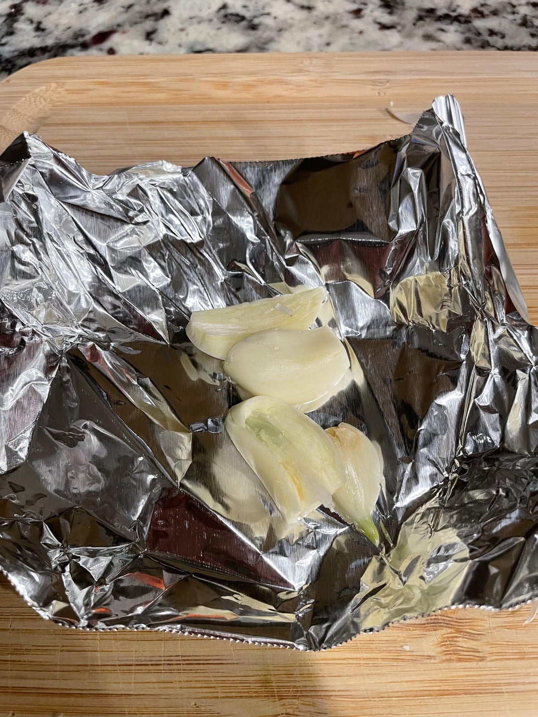 Halve and roast tomatillos for 13 minutes with drizzled vegetable oil, broil for one at the end. Toss the garlic wrapped in foil in there too