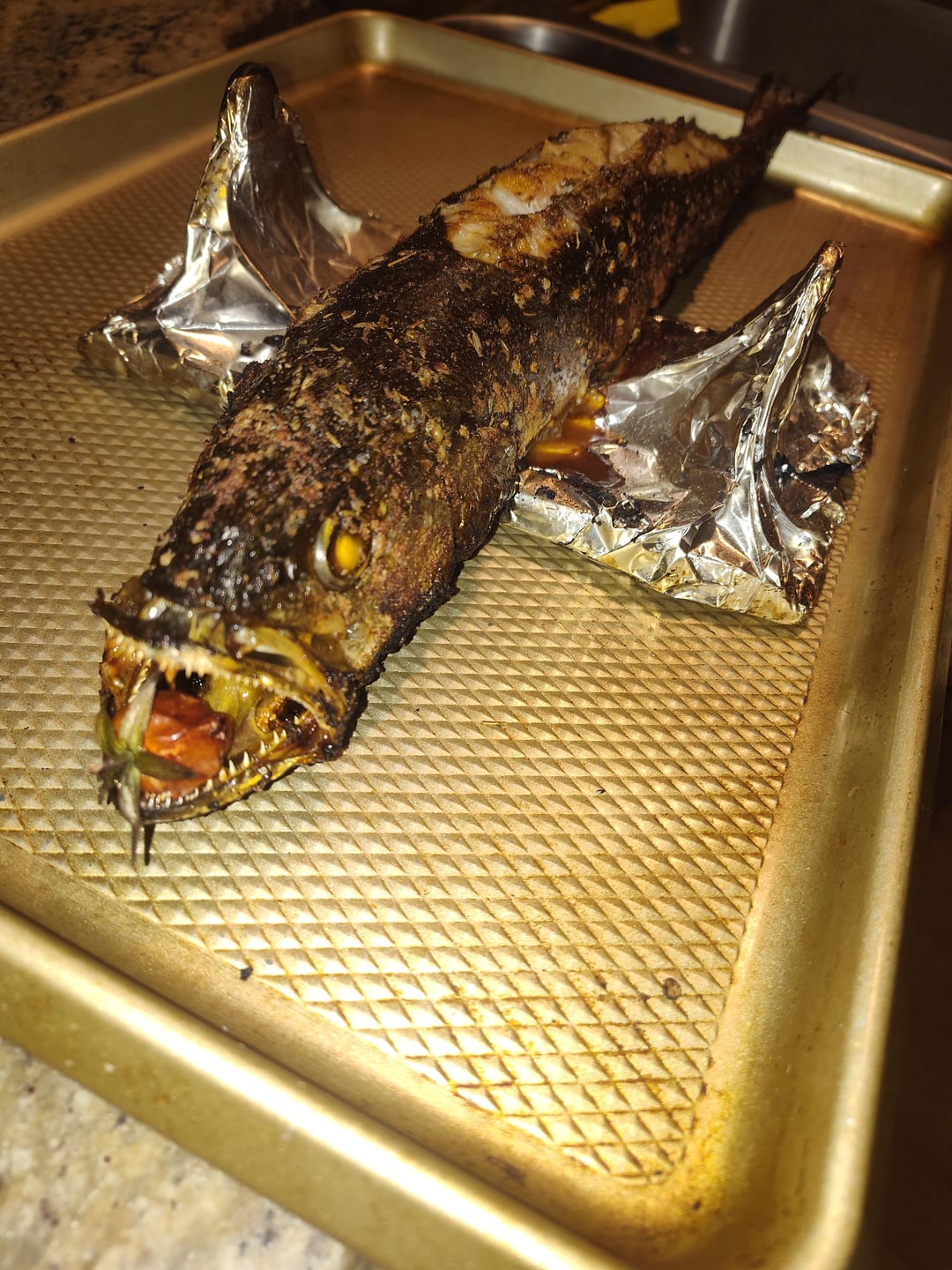 -Roasted whole sea trout- by thesedamnslopes 4 Comments Big_Money3469 8 months ago Hey yo! koopolil 8 months ago Now that’s something you don’t usually see here on this sub UpGooning 8 months ago Spooky fish EC_TWD 8 months ago It looks surprised. And pissed off.Write A CommentYou must be logged in to post a comment.