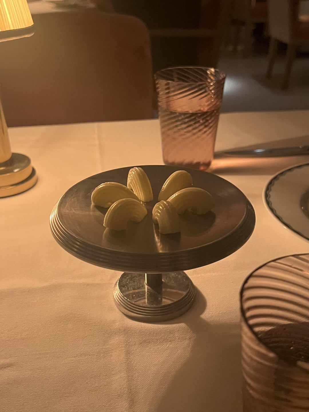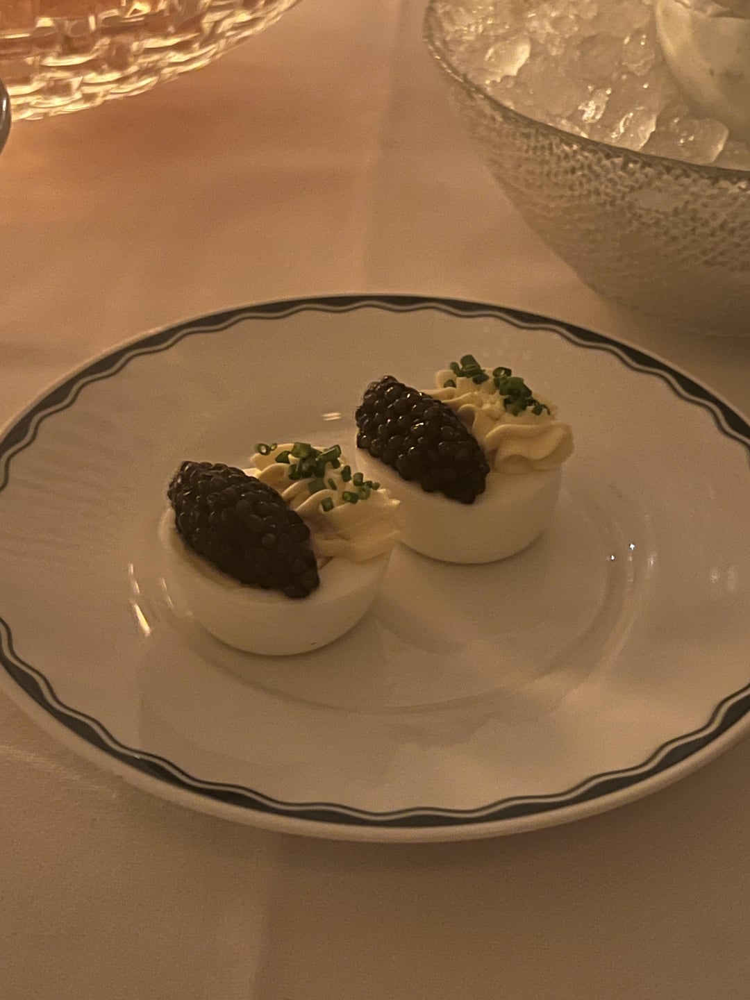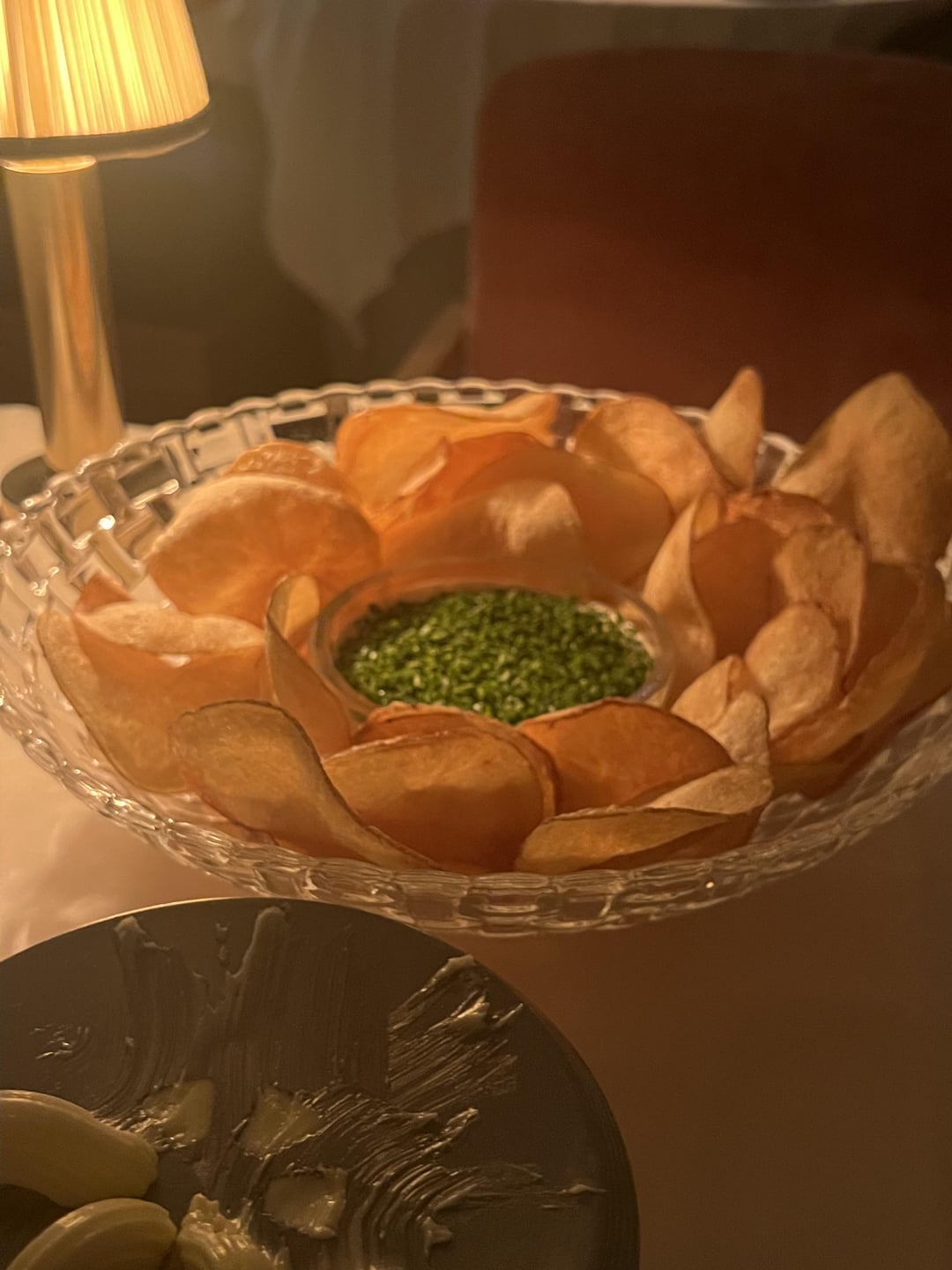 Wish I got pics of everything but I was enjoying everything bread service is amazing. Artistic presentation for the butter and bread was reminiscent of salted croissants . Cocktails are all great. Deviled eggs with caviar was an amazing starter; Had to order more. French onion dip with house made chips were amazing. Shamelessly asked for the rest Togo cuz they were so good and knew they’d be great hangover snack in the hotel room .