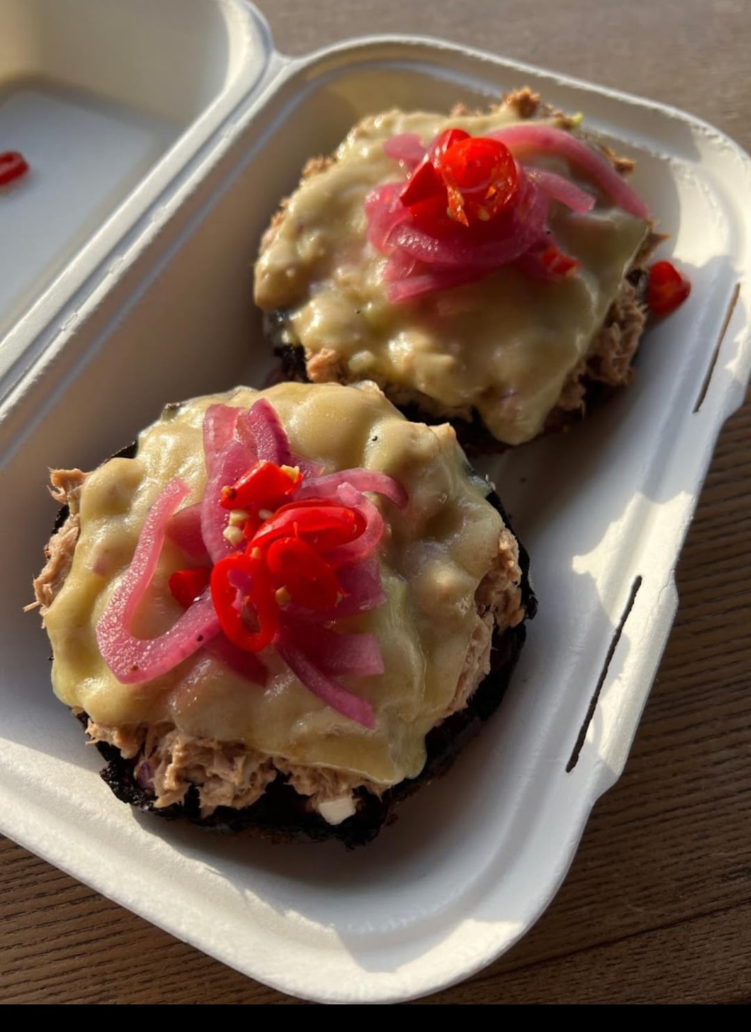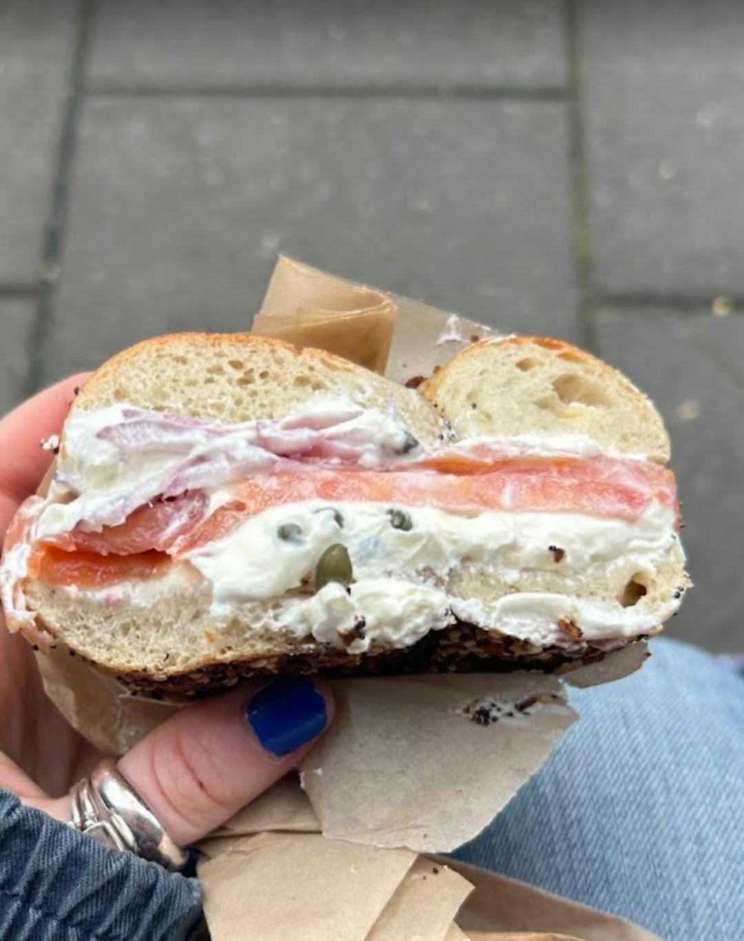 Half of a tuna melt sesame bagel (and half of a smoked salmon bagel ( smoked salmon,schmear, onions, tomatoes and capers )