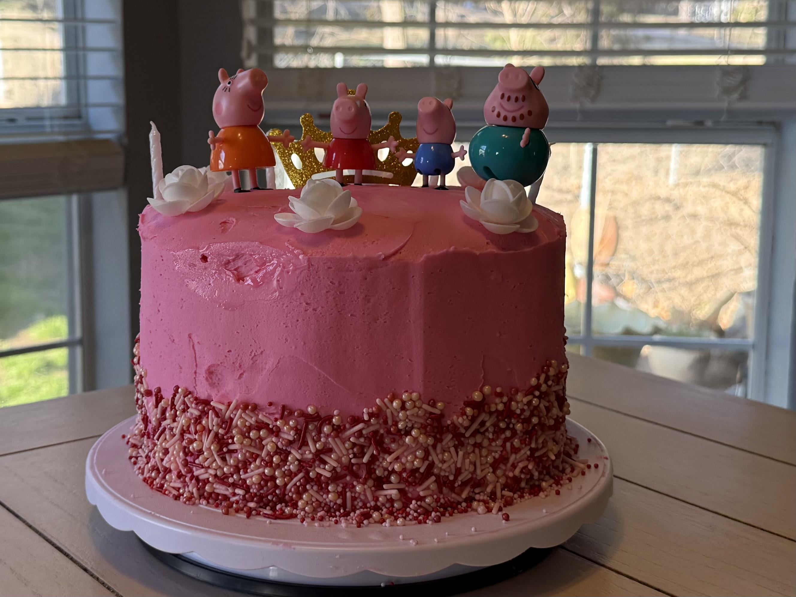 It’s cake, it’s pink, it has sprinkles, it has peppa&co and flowers. My girls would probably oooooh, aaaaah and woooow this cake! Well done! And it’s pretty neatly done! Only wins!