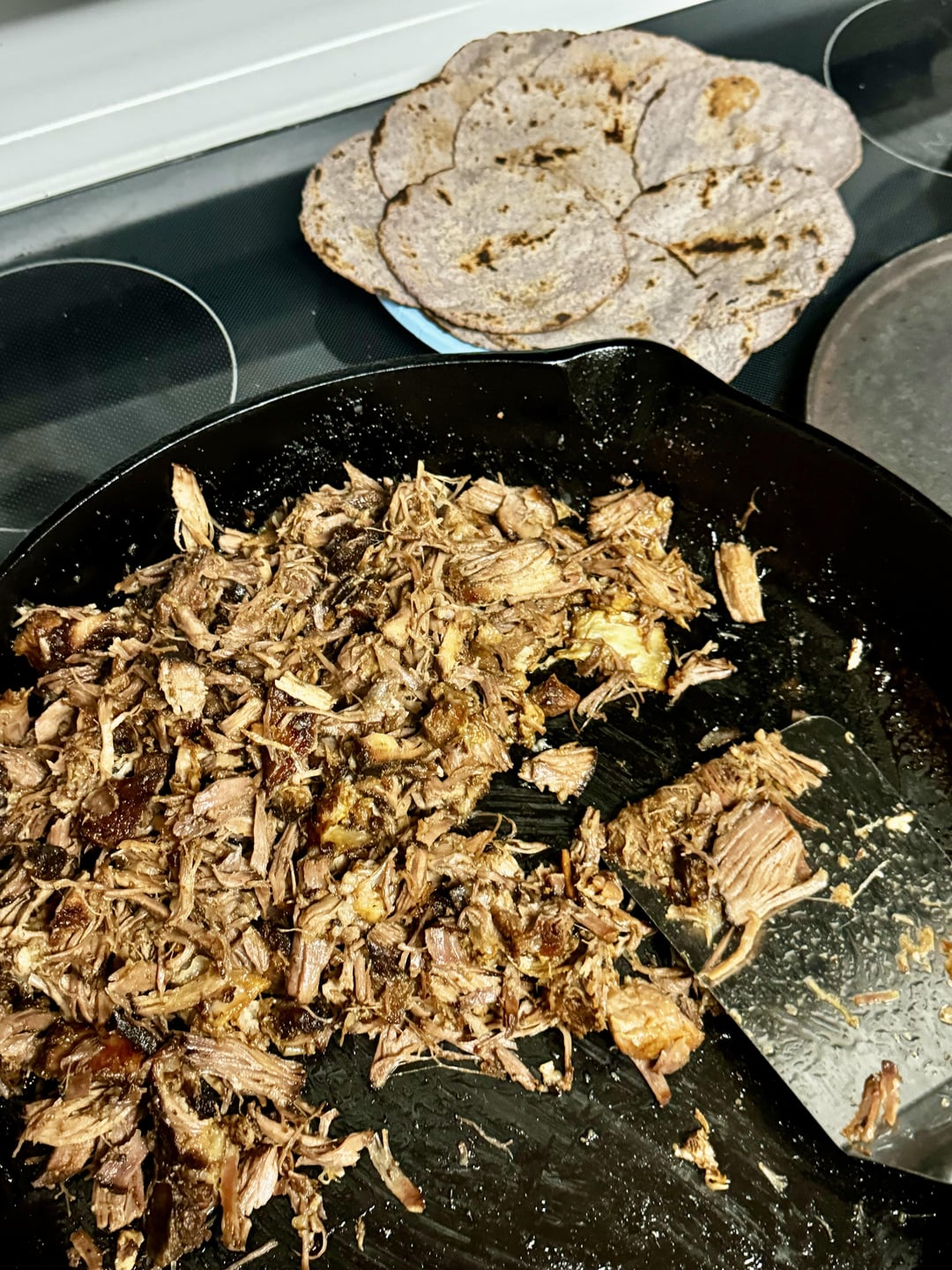 Served on 1/2 white 1/2 blue corn tortillas with a tomatillo based salsa.