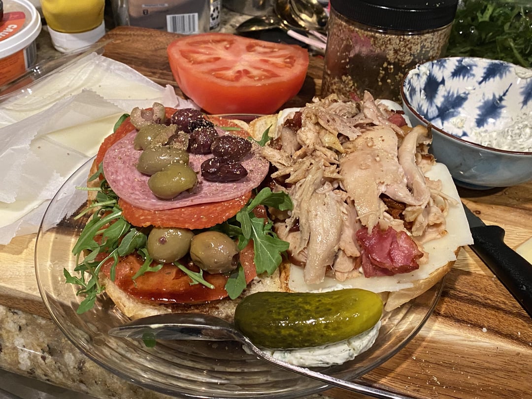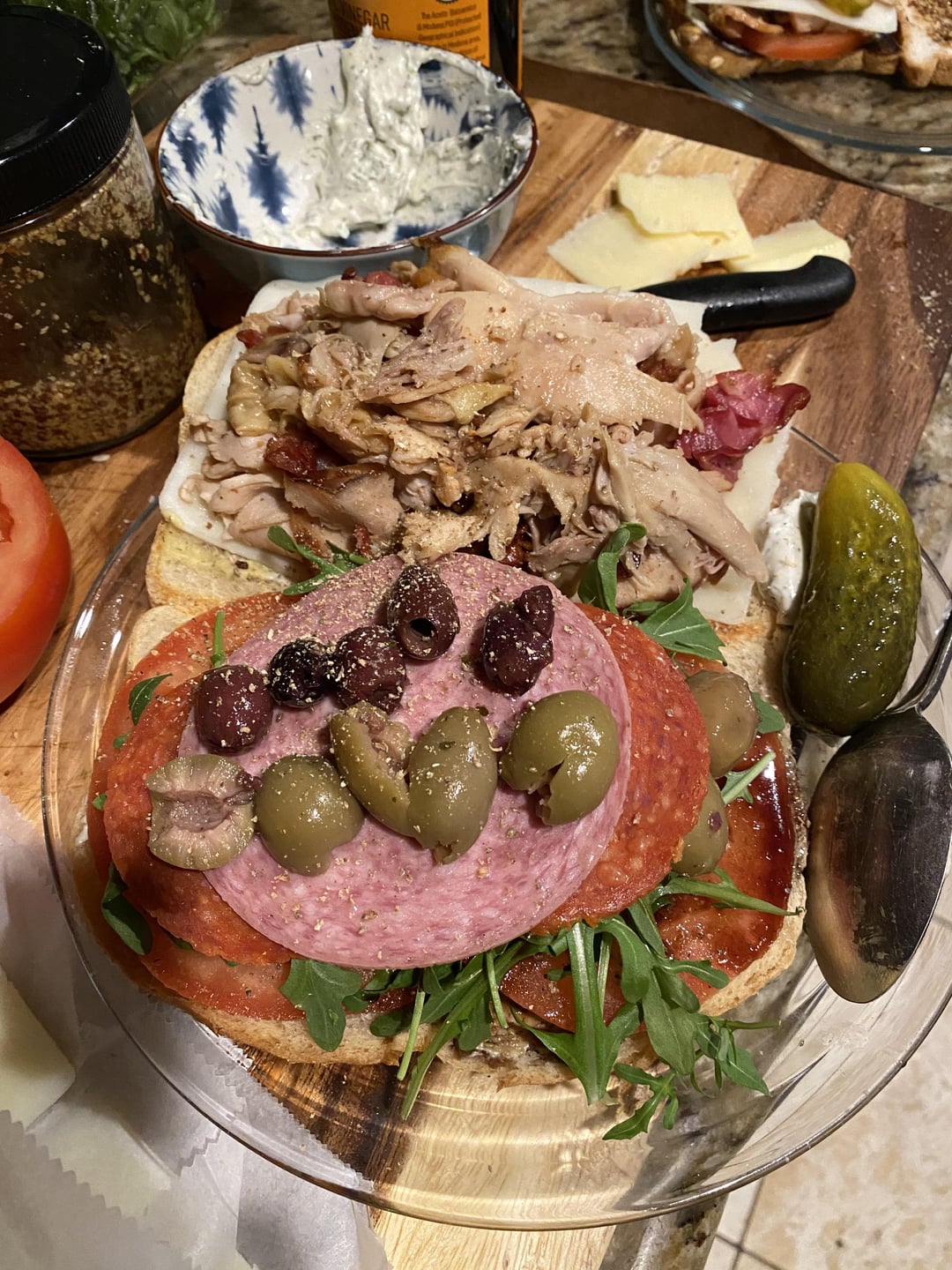 Grilled sourdough, Rotisserie chicken, bacon, kalamata and green olives, balsamic, avocado oil, manchego cheese, pepperoni, salami, arugula, beefsteak tomato, two kinds of turkey, ground white/green pepper and coriander, and a cream cheese/mayo herb spread.