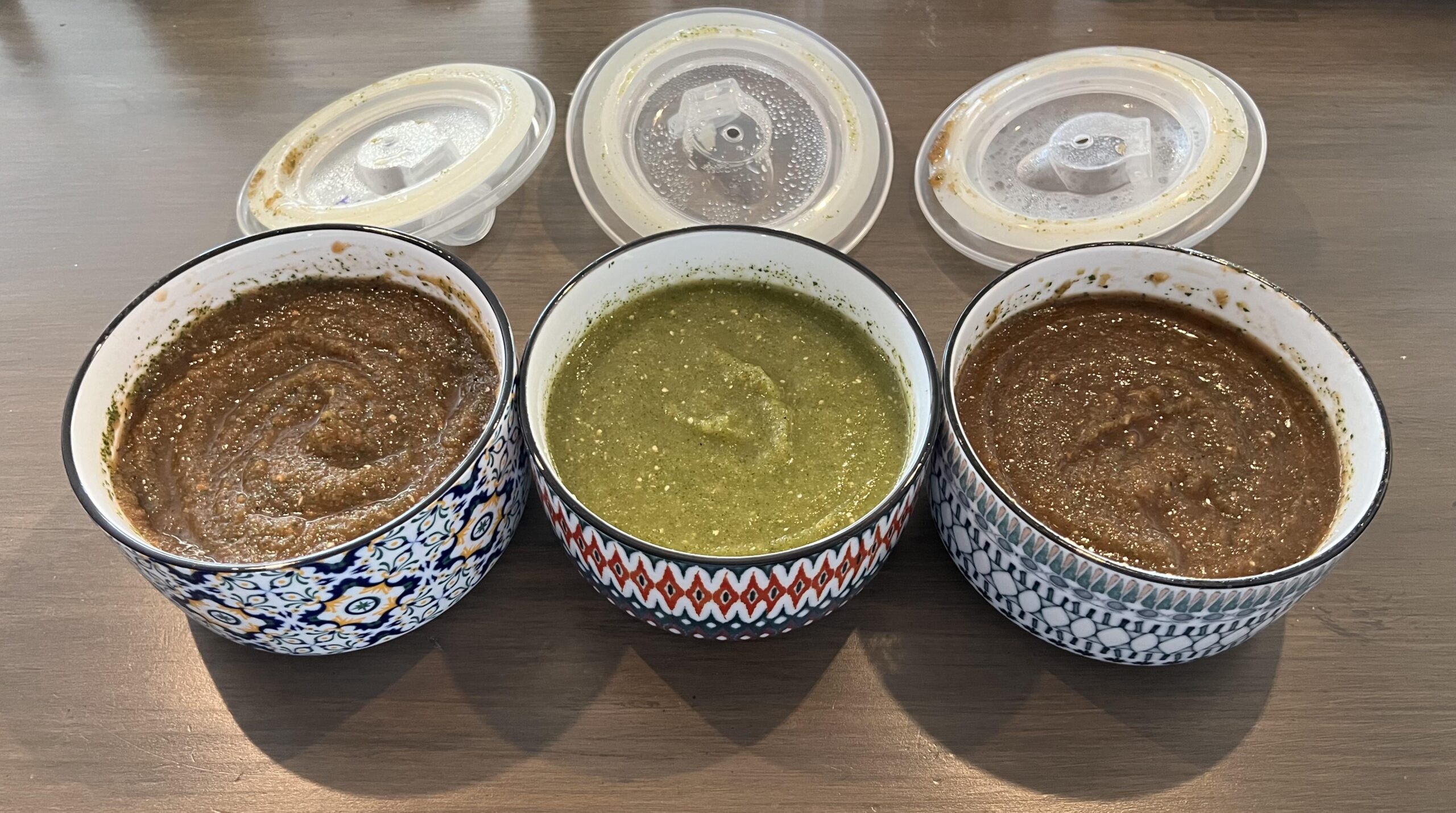 Split into two bowl, hot is then blended with 2 habaneros, medium is mixed with a little more tomato and 1/2 tsp sugar.