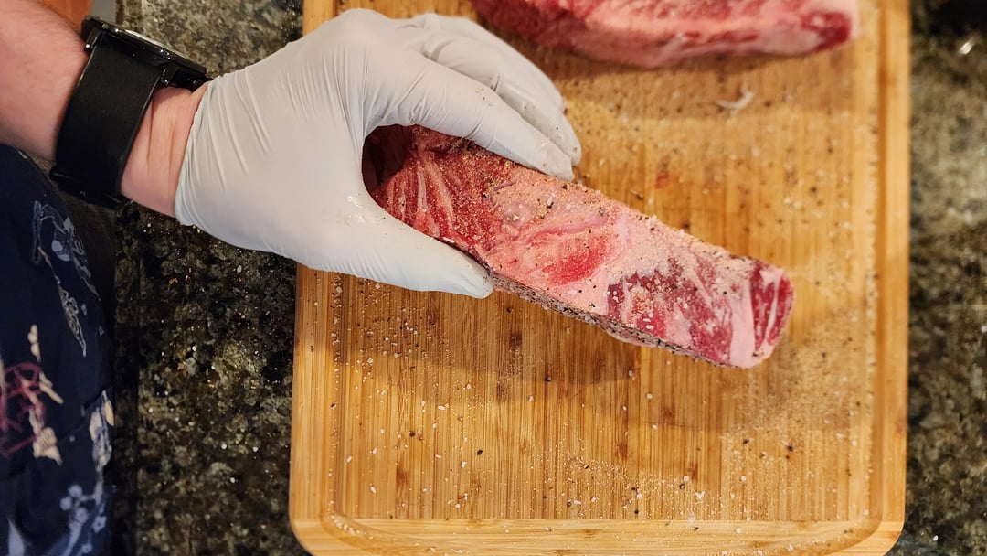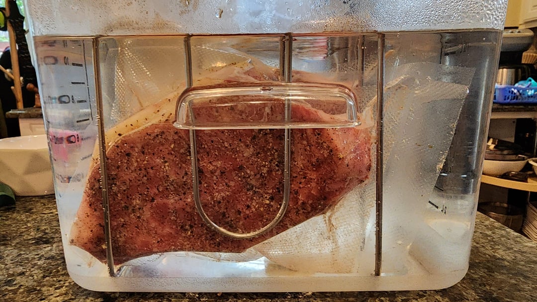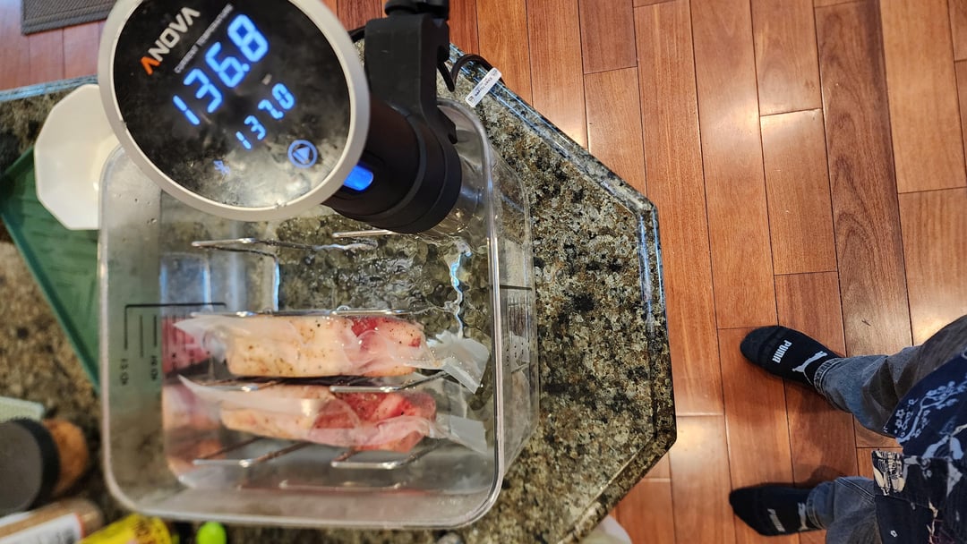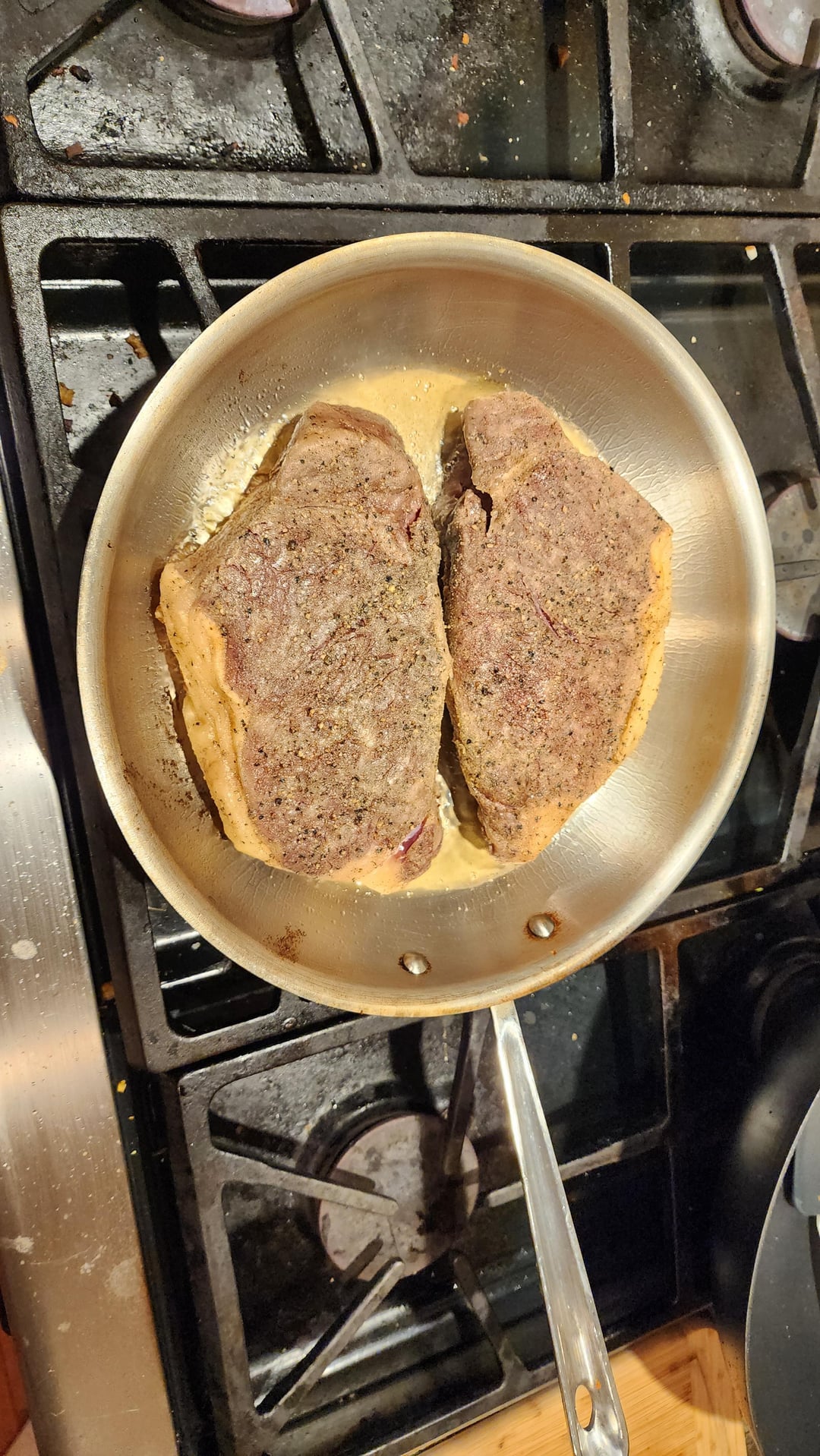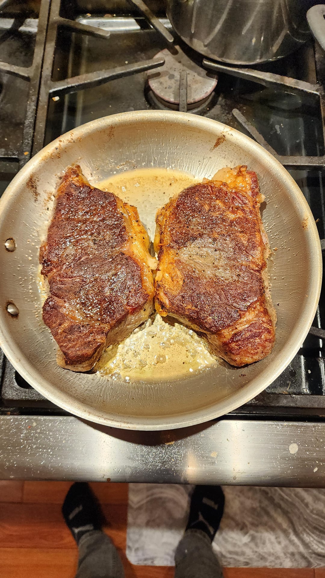 Cooked this wonderful wagyu reserve NY strip (2x). Each steak came in at a whopping 1.36lb! I have cooked these in the past and have found 2 steaks easily feed 4 people. SPG followed by straight into the bag and into the pre-heated bath. Cooked 2.5 hours before searing. A little disappointed my only picture post-flip shows the blind spot in the middle, but I did go back and get that nicely seared by spooning hot oil onto it.