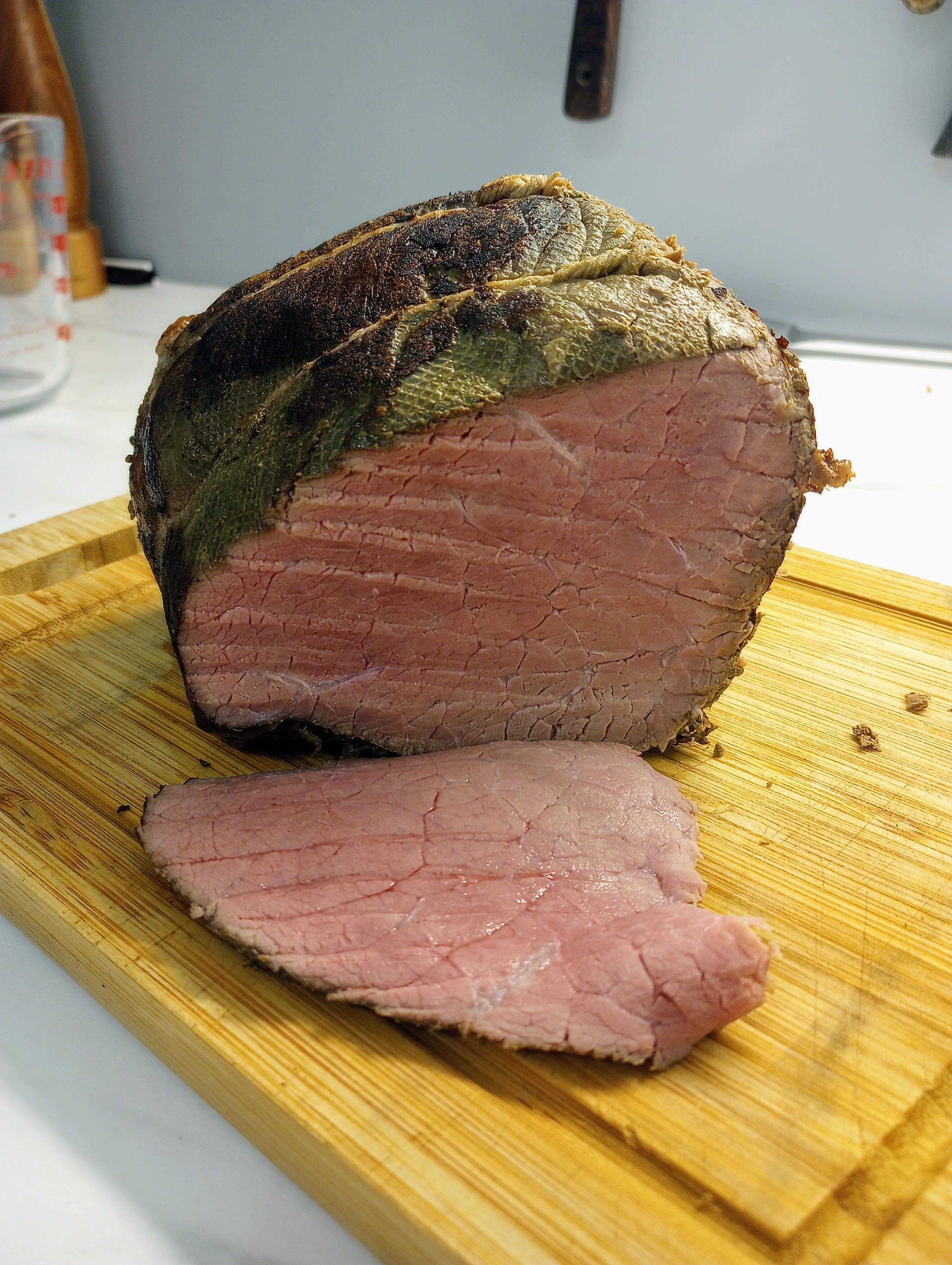 New to sousvide. First roast. Inside round , 24 hr at 134°F. Rendered a lot of juice so I thought it would be dry, but was moist and really tender. Almost smoked myself out of the house doing the sear, but overall really happy with the effort.