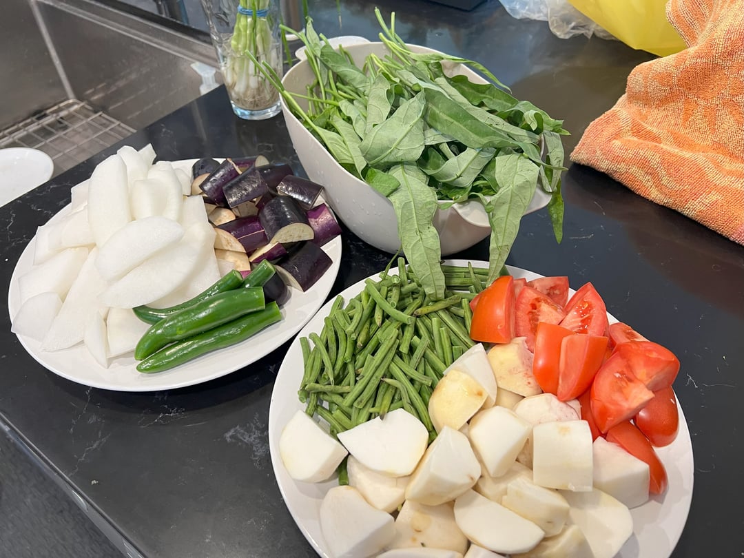 1. Boil the pork bones for 30 mins 2. Add the tamarind mix, tomatoes, and pork shoulder, boil for another 30 mins 3. Add each of the remaining veggies one by one in the same order they’re listed above. Allow the water to go back to a boil between adding veggies. 4. When you get to the ong choy, turn off the heat as soon as the water comes to a simmer, cover and let rest for at least five minutes.