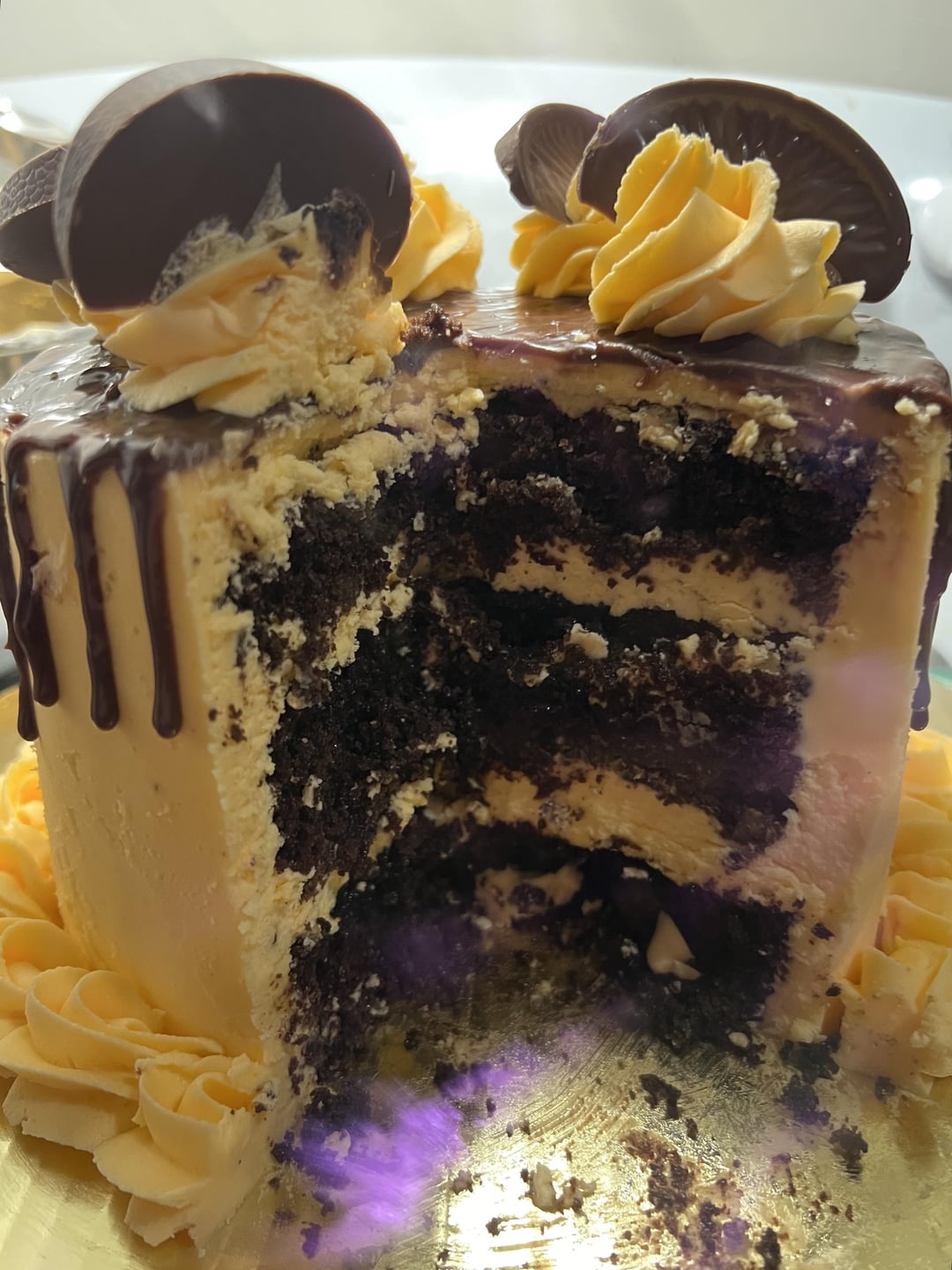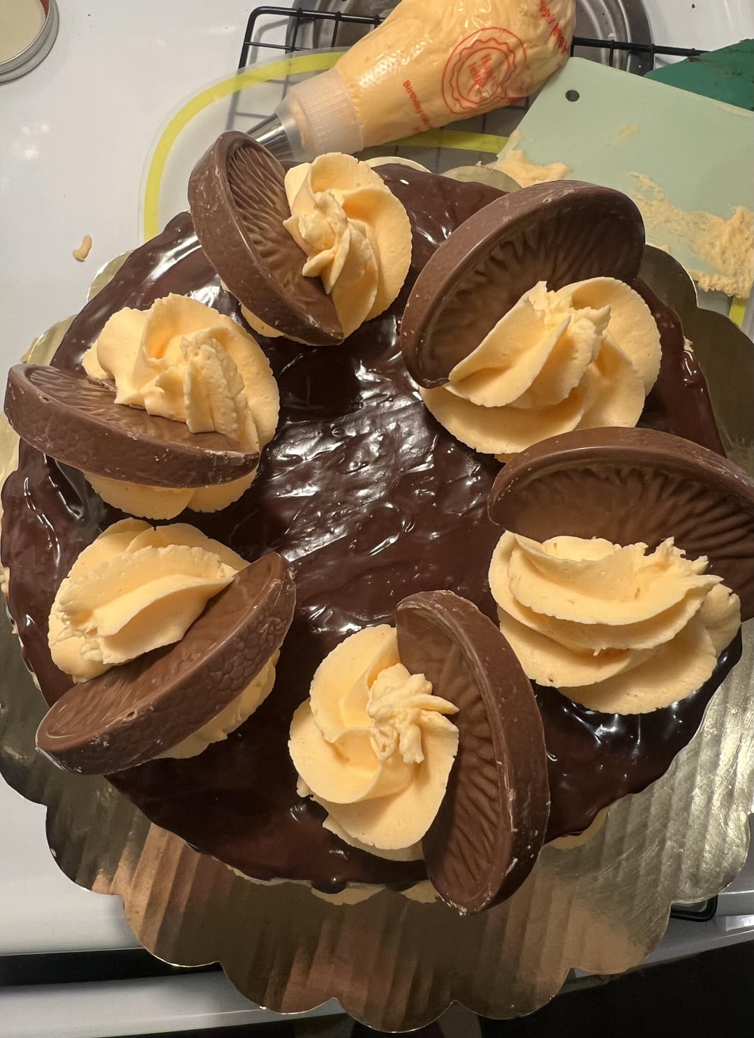 Concocted a terry’s chocolate orange cake!! The cake itself is chocolate and orange, with minced chocolate orange chunks baked in. The buttercream is orange, the ganache is actually melted down chocolate oranges! It’s delicious but the buttercream came out a bit too sweet for me, my partner LOVES it though.