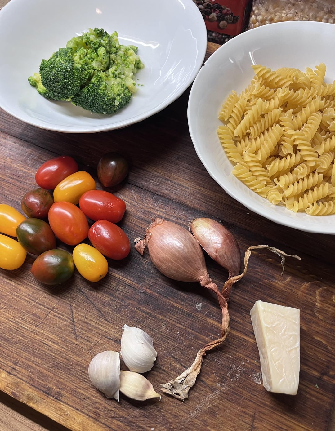 Pot, moderate heat, a bit of olive oil, chopped/sliced shallot and garlic, give it a few minutes but don't burn it, add the water, bring it to a boil, add the pasta, add salt, cook it al dente, add the tomatoes and the cooked broccoli. Take it off heat, let ot cool down a bit, add the grated grana padano. Add a bit of olive oil if needed. Check for salt and black pepper.