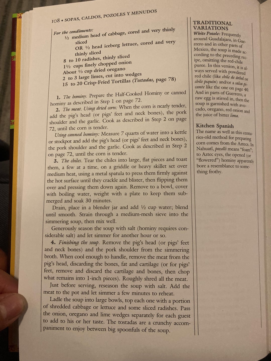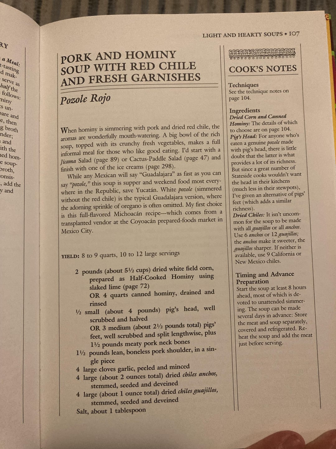 I was surprised that onion is only used as a fresh garnish and that the soup is only seasoned with 4 garlic cloves (no onion, no bay leaf) I cooked everything in 7 qts of water which may have been too much. The red Chile sauce also doesn’t call for seasoning with other aromatics and isn’t fried before being added to the pot.