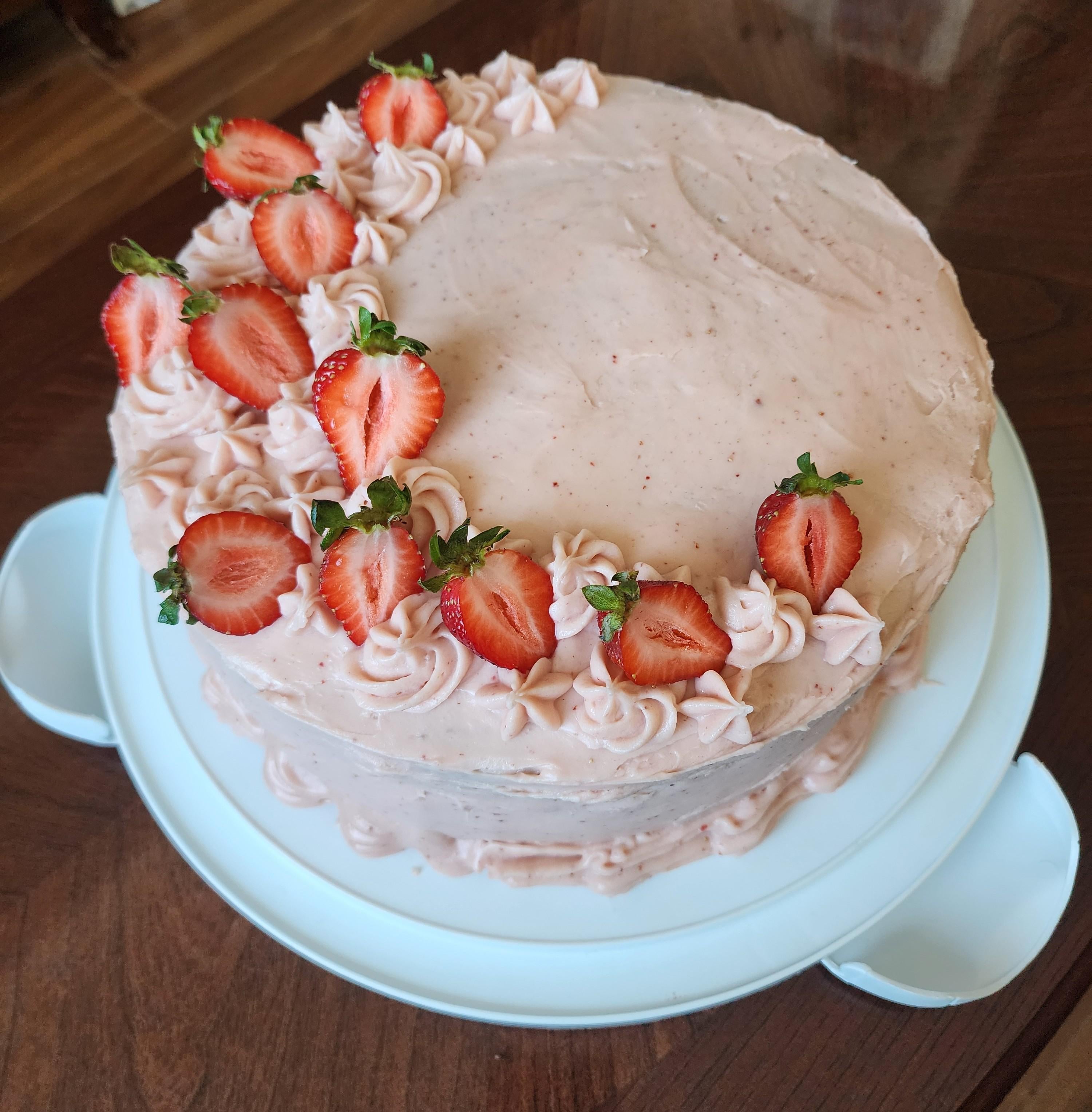 Long time lurker, first time poster in this sub. My partner requested a chocolate strawberry cake for his birthday, so I did chocolate sponge, stabilized strawberry whipped cream filling (stabilized with cream cheese to keep it vegetarian) and strawberry cream cheese frosting. This is only my third layer cake and third time piping. I definitely need to improve my frosting and piping skills but I'm very impressed with myself. It was extremely delicious.