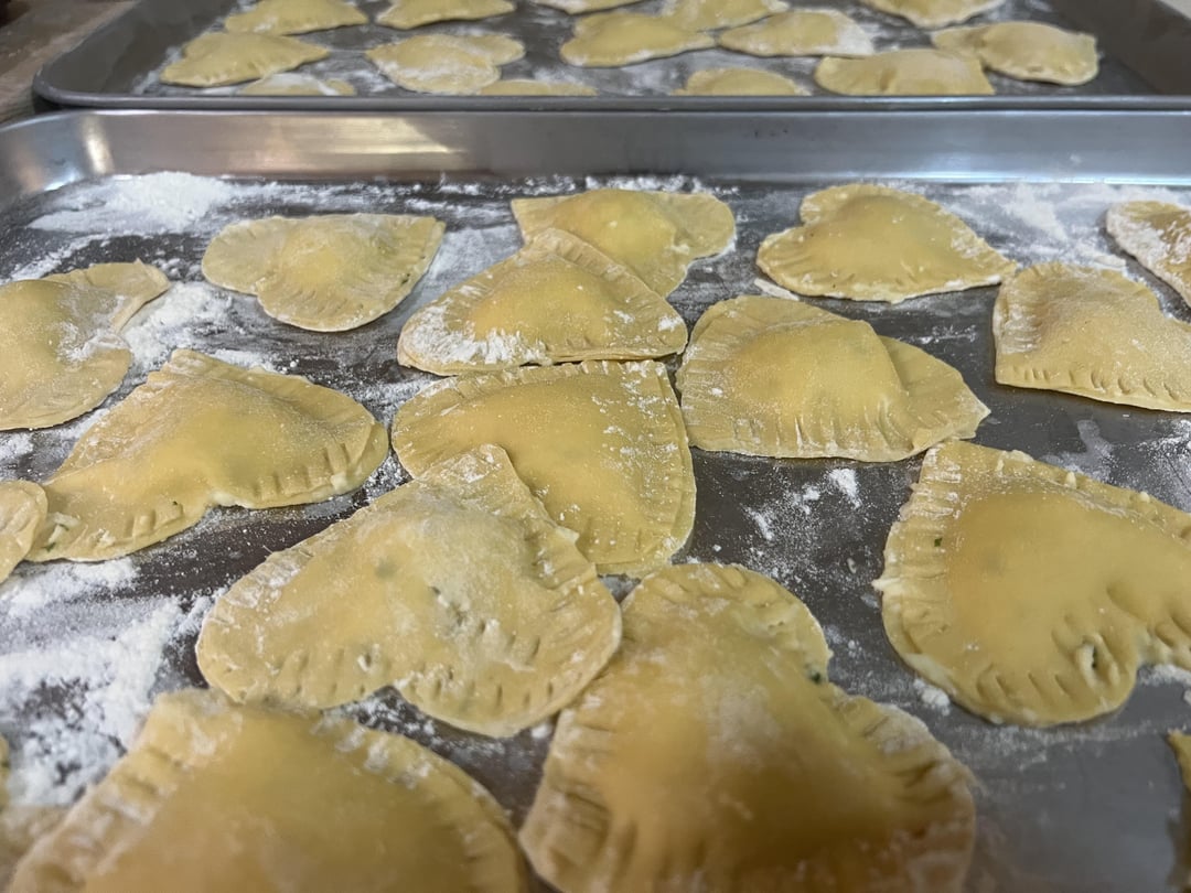 DJ_AC 9 months ago Here’s the recipe: Pasta: 3 cups flour, 4 eggs, olive oil.Filling: ricotta, Parmesan, Romano, mozzarella, salt pepper Just like 1/2 cup ricotta, 1/2 cup Parmesan, and a bit of the other two. Add salt, pepper. I chilled the pasta after cutting it and chilled the filling in the freezer for a bit.