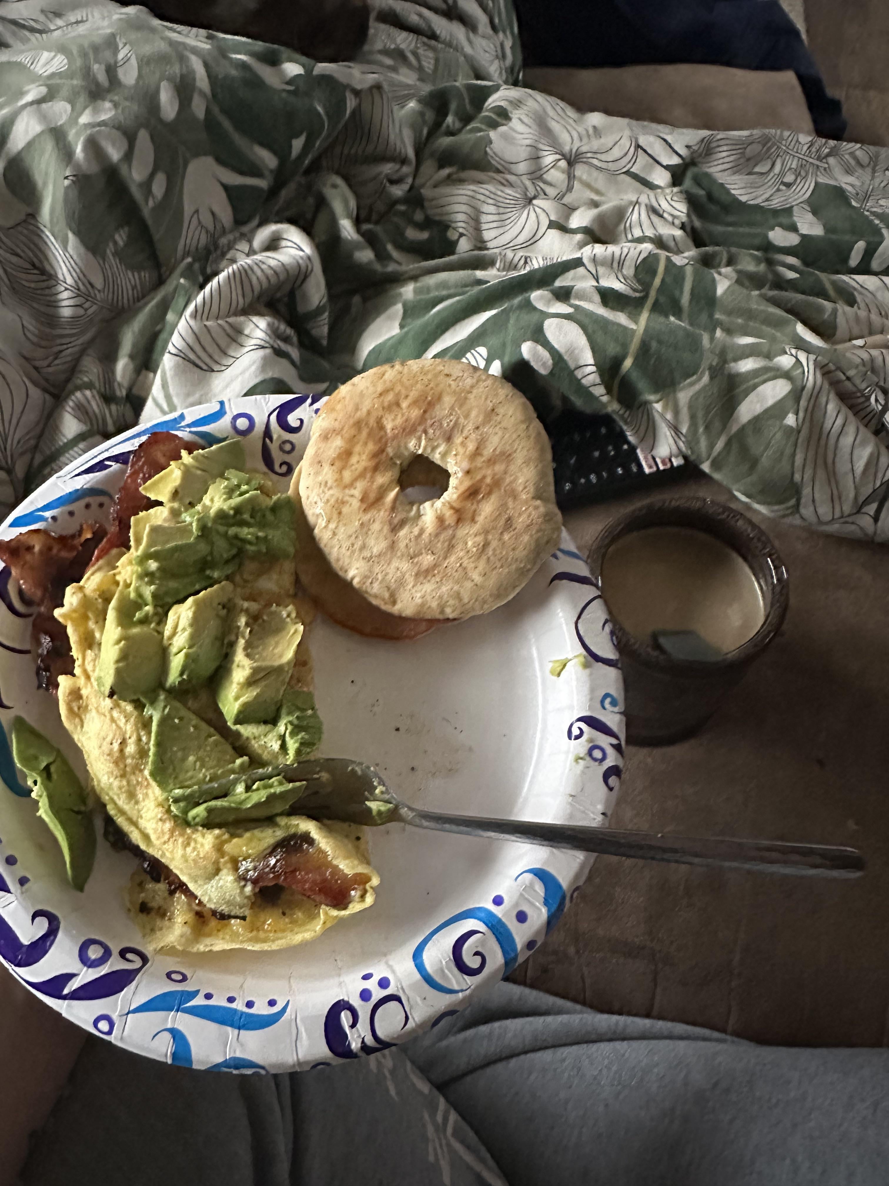Omelette with two slices of bacon, two eggs, two tablespoons of cheese, one keto bagel with butter, and coffee with 2 tablespoons of cream and monk fruit.