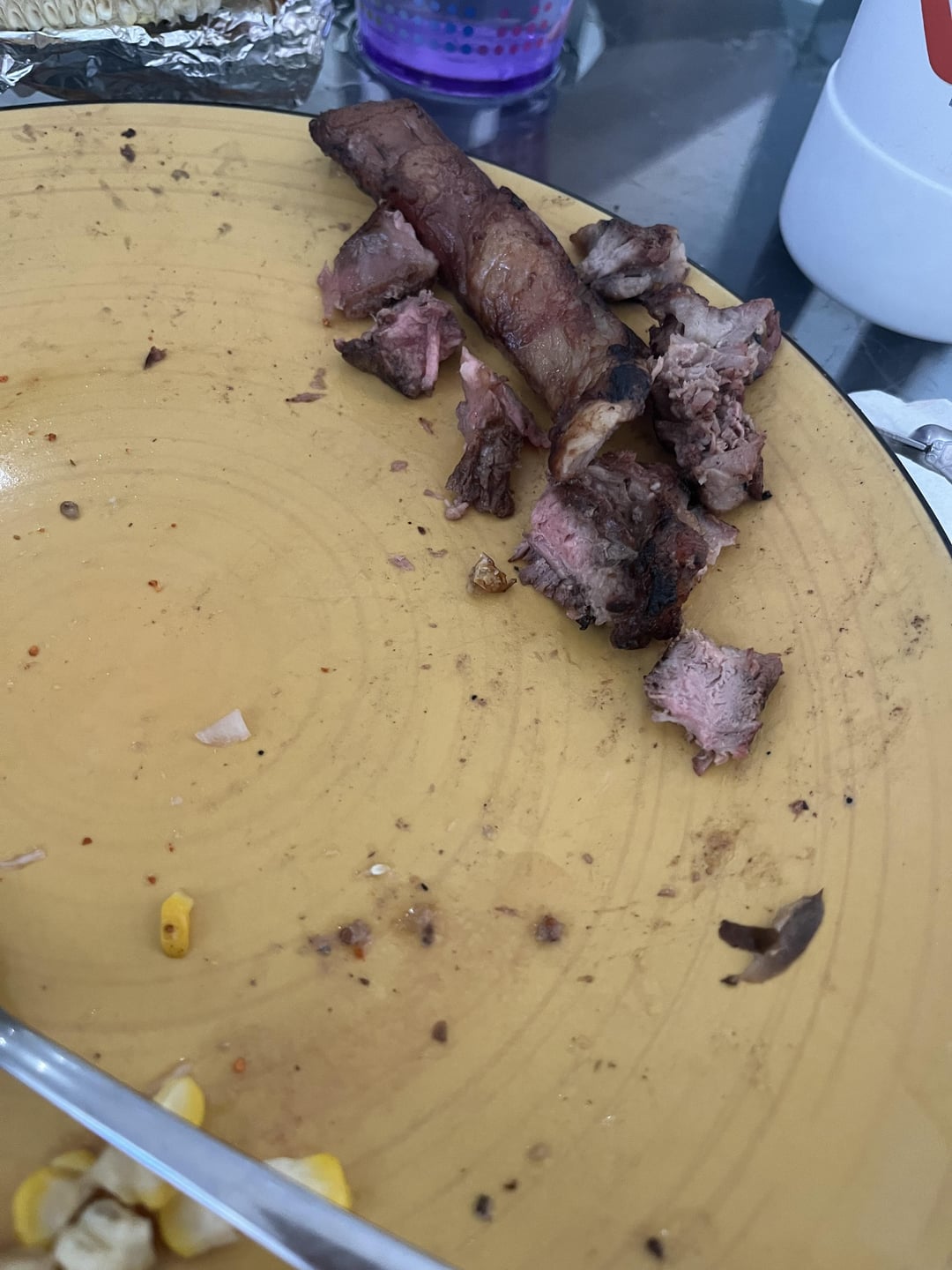 Just a plain ny strip steak, no oil or butter or anything. Hard to see, but under first pic is fatty strip I took off cause I don’t like the texture. 2nd picture is what was left.