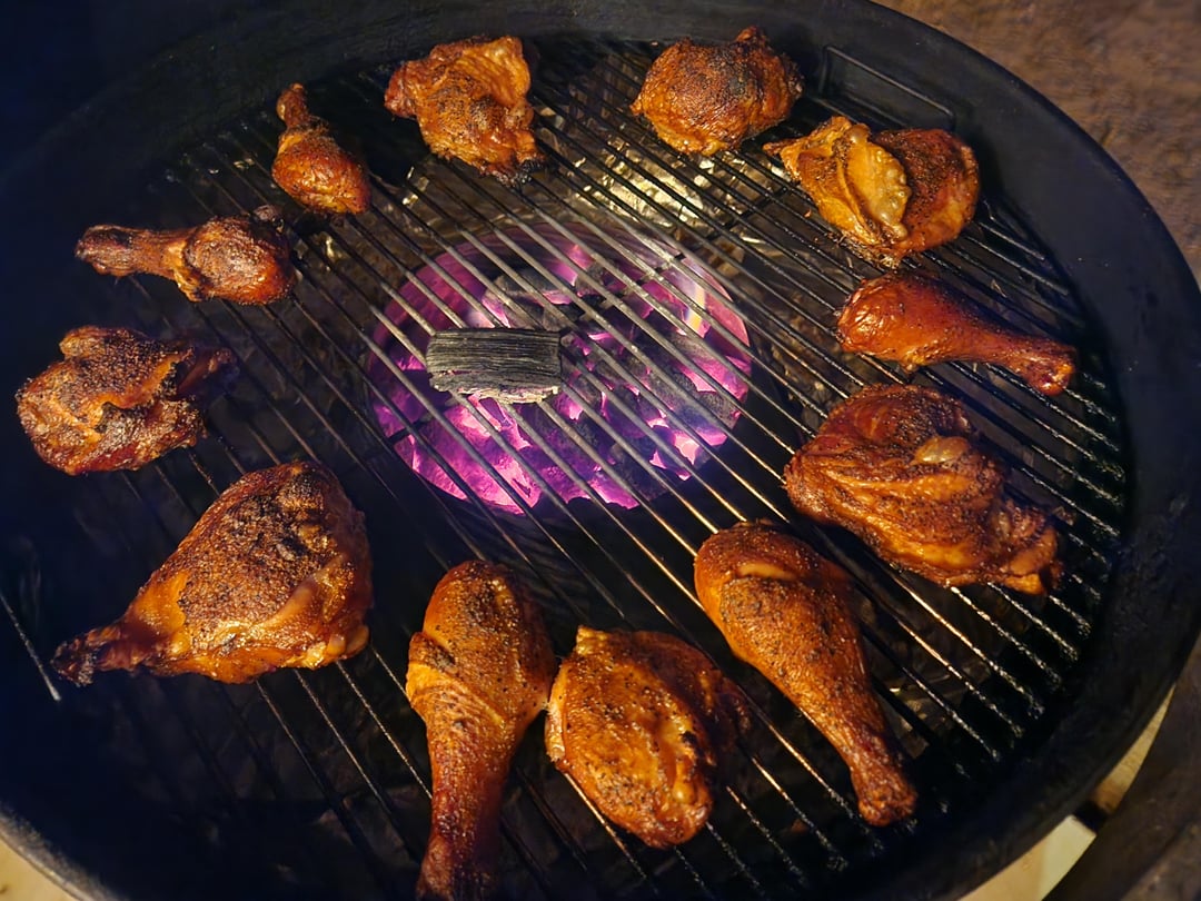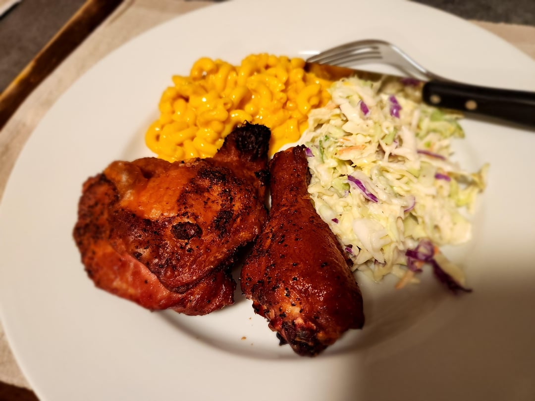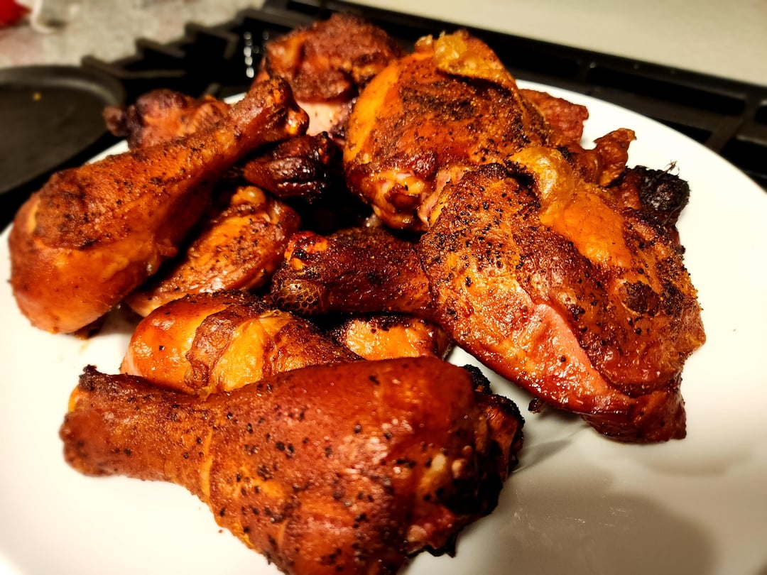 Chud's crispy chicken video for guidance. First time trying spray on duck fat. Dog wondering why he didn't get any skin scraps this time.