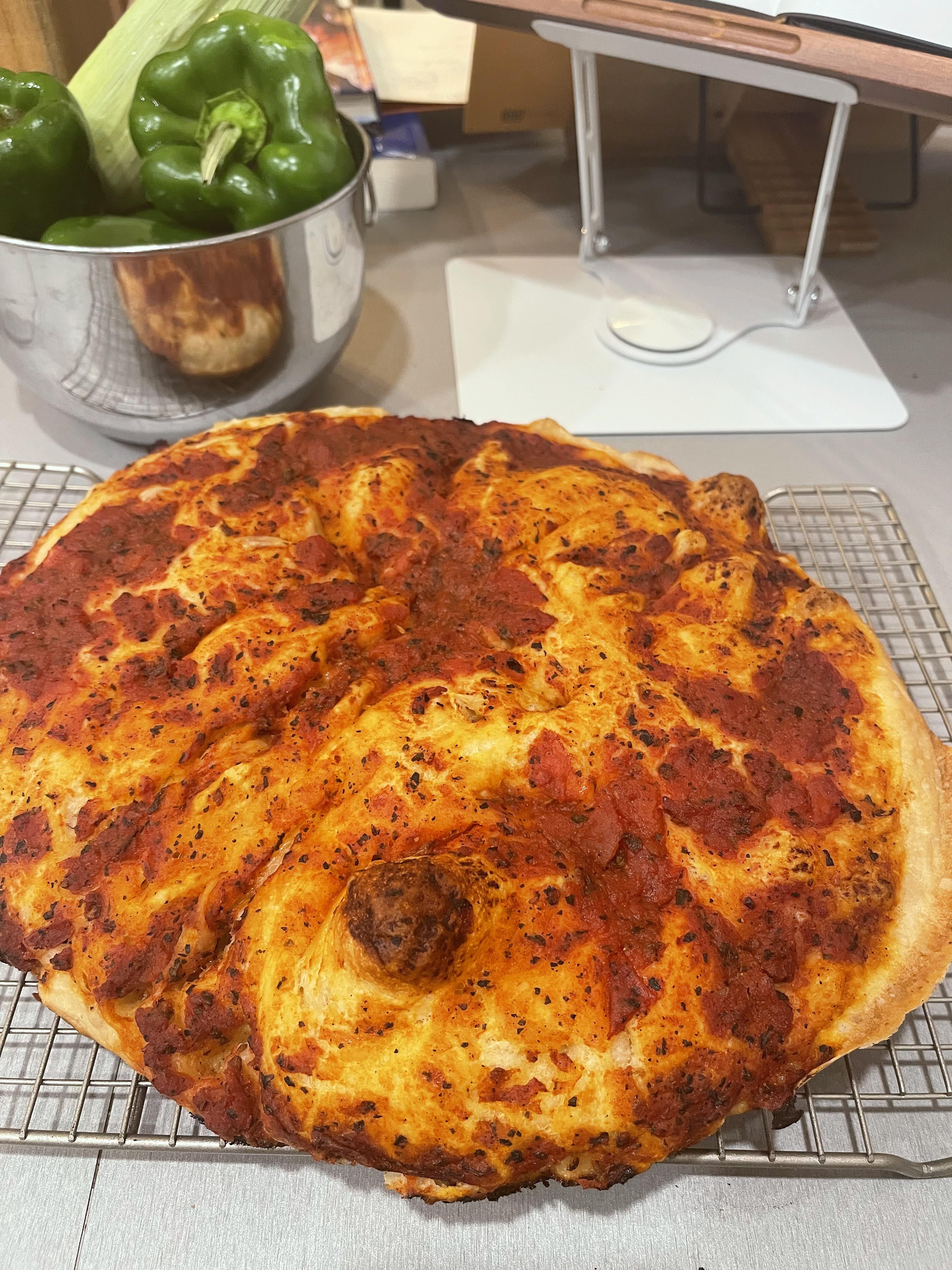 Made my first bread on the BGE! I made a focaccia with a basic marinara on top! It tastes wonderful, but it took a little longer to cook because of all the moisture brought the temperature down. I’d make it again.