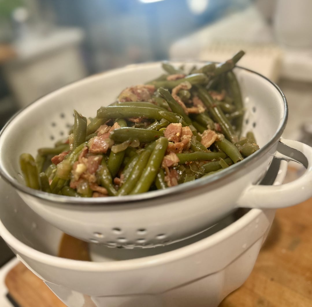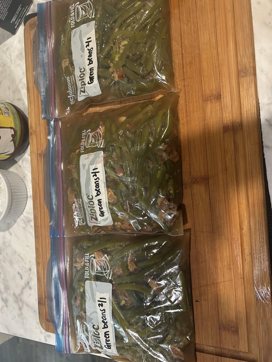 Slide 5/6: Southern-style green beans: This is my first time trying to freeze this as well, so I’m not sure how it will work. But sautéed bacon, onion, and garlic with 2 lbs of fresh green beans covered halfway with half chicken, half beef stock seasoned with garlic, onion, salt, pepper, and red pepper flakes simmered for about 1.25 hours.